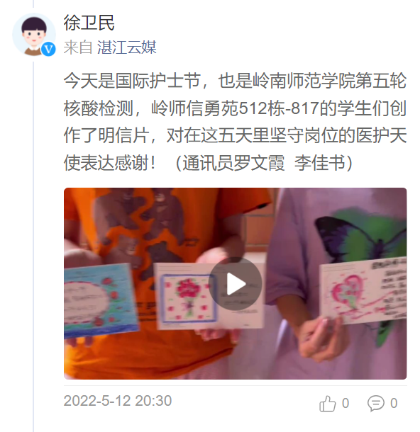 今天是国际护士节,也是岭南师范学院第五轮核酸检测,岭师信勇苑512栋-817的学生们创作了明信片,对在这五天里坚守岗位的医护天使表达感谢!