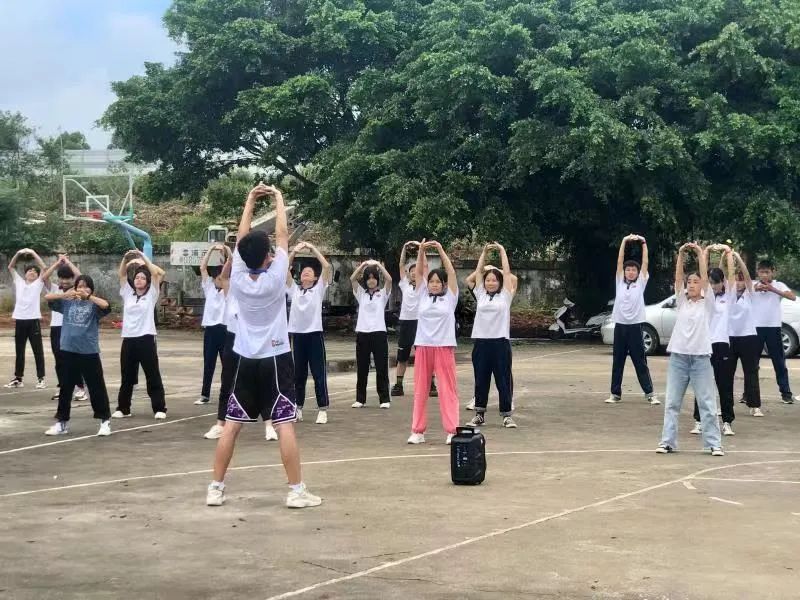 “来,同学们看着老师,跟着动起来。现在做的是第一式,两手托天理三焦。”