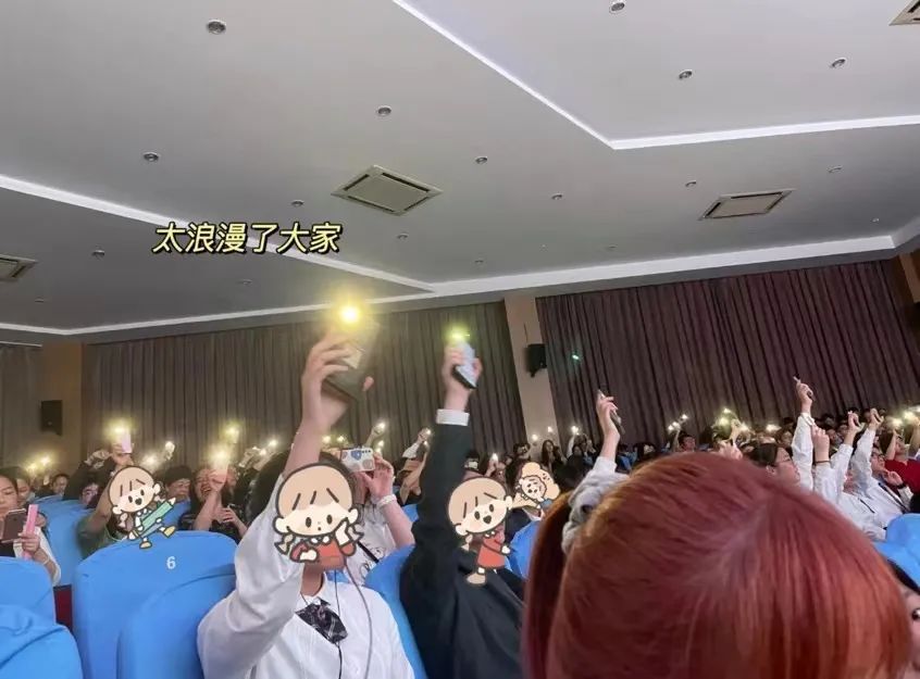 唱歌的时候,大家一起打开了手电筒。听坐在最后一排的同学说,从她们的视角看,这片光海真的很感人很感人。@Eating