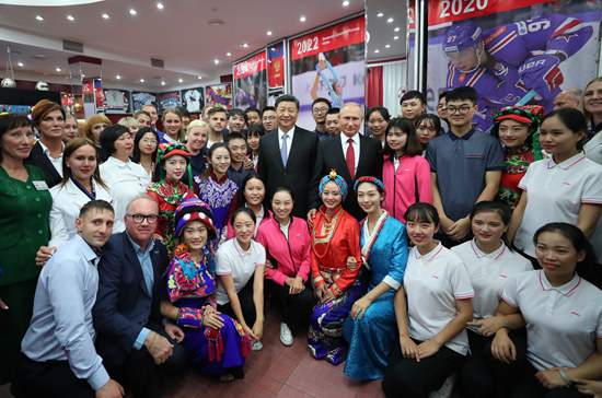 9月12日,国家主席习近平在符拉迪沃斯托克同俄罗斯总统普京一起访问“海洋”全俄儿童中心。这是习近平和普京同中俄青少年代表及中心教职工代表合影。新华社记者 鞠鹏/摄