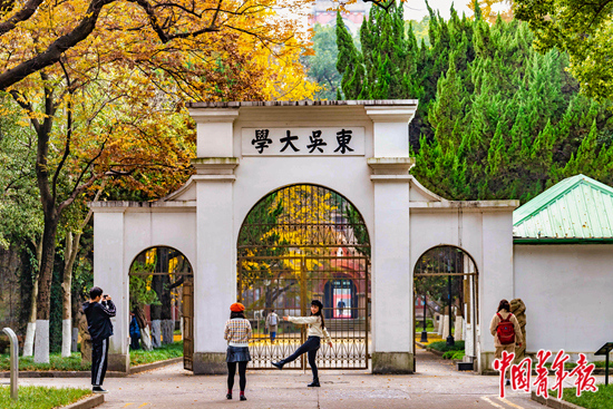苏州大学的黄叶与校门掩映,成为同学们拍照打卡的胜地。中青校媒记者 黄琳茜/摄