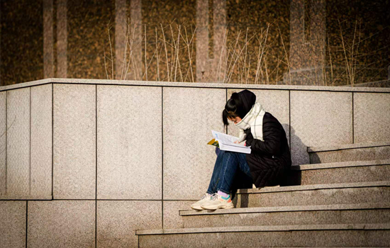 太原理工大学里,一位女生坐在台阶上读书。太原理工大学供图