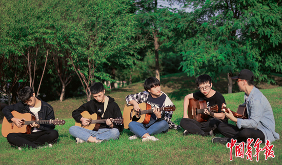东北大学吉他社成员在校园里的草坪上练习。中青校媒记者 袁玉蔓/摄