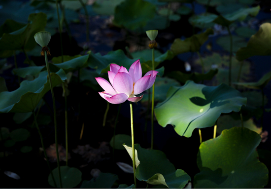 集美大学一隅,粉色的荷花在碧绿莲叶间绽放。集美大学供图