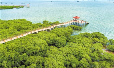 万顷波上鸥鹭飞,远帆片片归,蓝天碧海红日白沙,青翠的红树林与碧绿的海水浑然一体,一望无际,形成了一道天然的美丽风景线。这是记者近日在廉江高桥红树林区探访时看到的诗意画卷,诗人王勃的“落霞与孤鹜齐飞,秋水共长天一色。”千古名句在这里可得到验证。