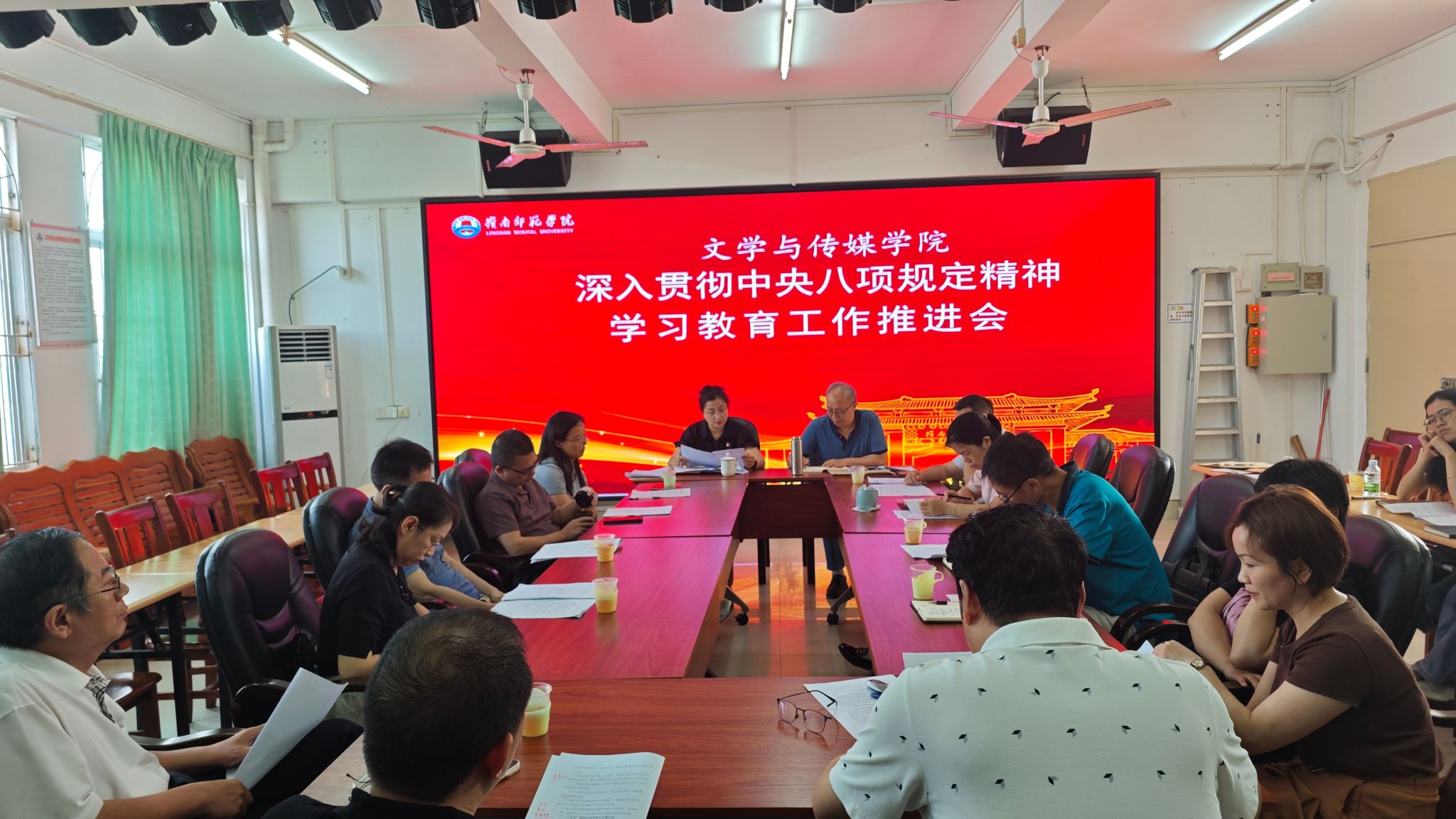 4月22日,文学与传媒学院在学院会议室召开了深入贯彻中央八项规定精神学习教育工作推进会,学院领导班子、各党支部书记、各系部主任和教师代表参加了本次推进会。