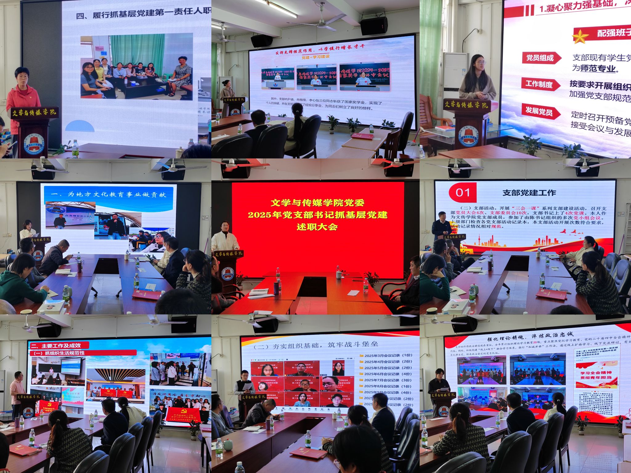 为检验2025年度基层党建成效,压实支部书记抓党建“第一责任人”职责,12月31日,文学与传媒学院党委在学院会议室召开2025年党支部书记述职大会。学院领导班子、各党支部书记及支部委员参会。