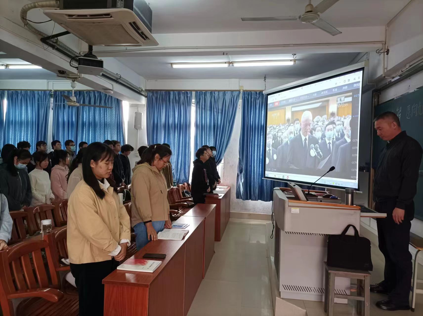 国歌奏毕,现场师生认真收看习近平总书记在江泽民同志追悼会上的致悼致词。其悼词表达了全国各族人民对江泽民同志的深切缅怀,深刻总结了江泽民同志对中国改革开放的贡献。