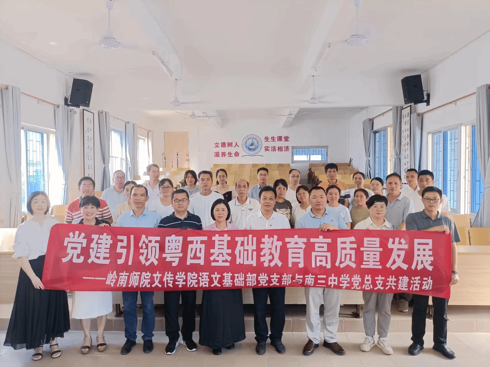 4月15日,文学与传媒学院党委教工语文基础部党支部与湛江市坡头区南三中学党总支共同开展“党建引领粤西基础教育高质量发展”帮扶共建系列活动,以“党建+”结对共建为抓手,帮扶该校党建工作提质增效,激活基础教育高质量发展动力引擎。文学与传媒学院党委副书记梁碧斐,副院长李斌辉,语文基础部党支部书记陈斐,南三中学党总支书记袁观保,校长詹赵雄,文学与传媒学院语文基础部党支部成员及南三中学党总支成员、语文科组教师等领导、老师参加本次系列活动。