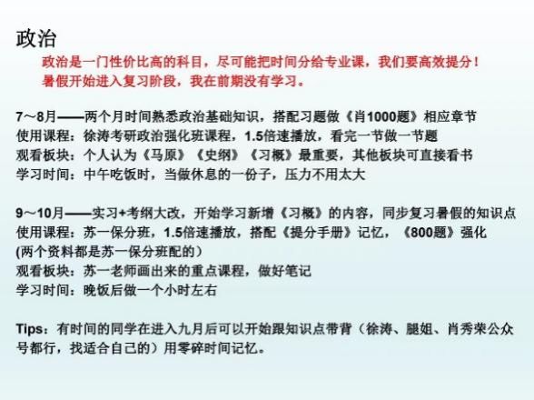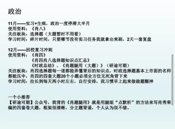 在备考期间,她合理灵活安排时间,将备考分为三阶段。在大三下学期正式开始备考时,她将课程表空课列出来,根据参考书的内容厚度情况见缝插针地学,保证在空课时间都会有一定的知识摄入,如阅读教材、接触英语单词,使自己渐入备考状态。她将暑假时间称为是备考的“黄金期”,在此期间自身备考状态可达百分之百,因此她选择留校自习。早上时间用以复习专业课一,下午则以政治、英语“醒神”,晚上复习完专业课二后进行复盘,检测当日学习效果。针对这漫长的复习周期,她表示“日复一日的备考确实很枯燥,但是没有办法,考研就是让自己坚持下去”。在考研冲刺期,她利用无实习任务的时间且在下班后在办公室继续复习,将庞大的背诵计划细分到每一天,力求以一轮的效果抵两轮的效果,追求背诵质量而非背诵数量。