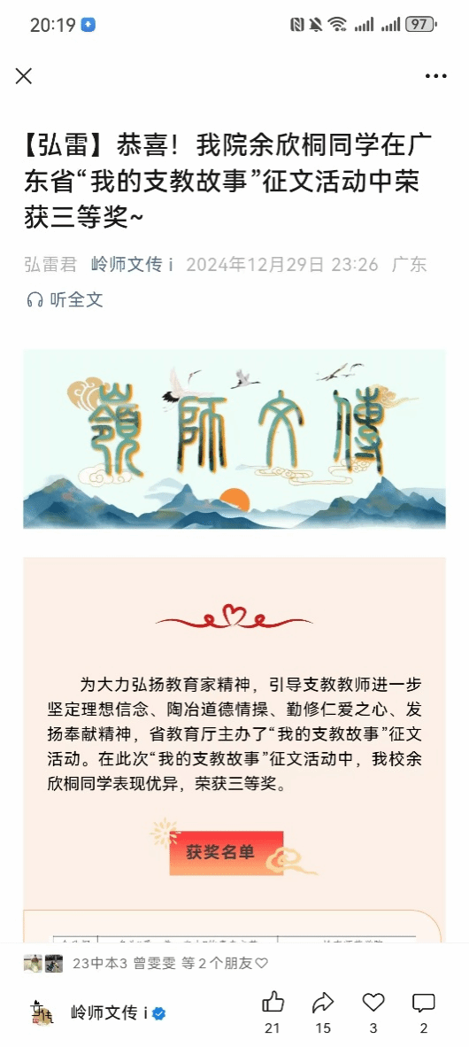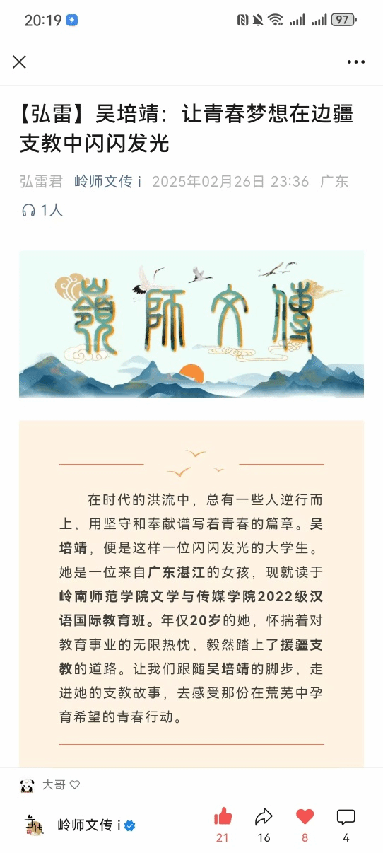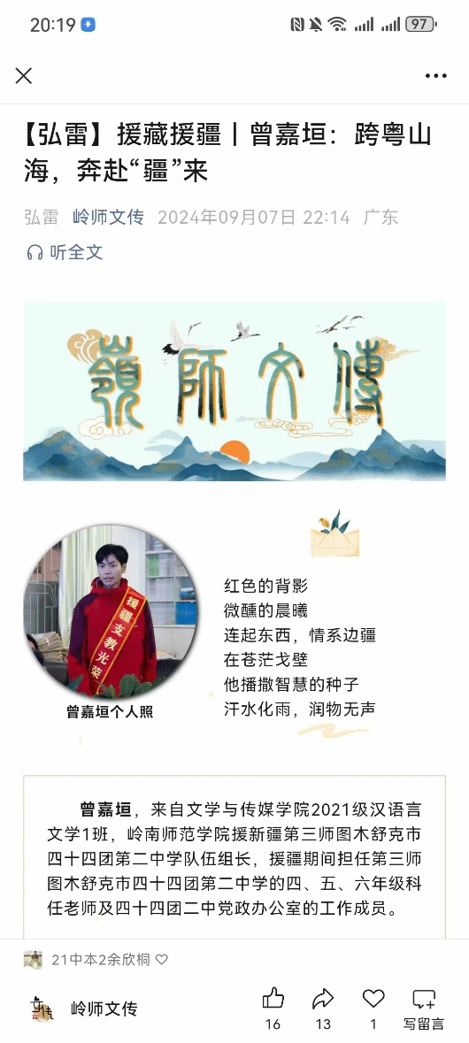 近十年来有43位文传学子参加援藏援疆支教工作。援藏援疆是文传学子服务边疆的志愿服务行动,也是培育爱国情怀的重要路径。在学院党委的指导下,学生工作围绕着立德树人为根本目标,实施“沃土计划”“脱颖计划”“青苗计划”“追光计划”四位一体、贯穿全程的援藏援疆青年志愿服务与爱国情怀培育的行动计划。具体表现:“沃土计划”,配合学校开展良驹助教工作,培育一批有志于援藏援疆的学生,营造良好的援藏援疆选拔氛围;“脱颖计划”是落实学校对援藏支教、援疆支教的选拔工作需要,通过对学生的综合素养进行选拔,并对选拔出来的援藏援疆学生开展业务培训和安全知识培训;“青苗计划”是启动学院教学实习工作的管理机制,实施思政导师-实习导师-实践导师-论文导师四位一体开展志愿服务全程指导,引导学生在教学课堂、劳育美育、班级管理、德育活动开展等方面的能力提升;“追光计划”聚焦于对援藏援疆学生优秀故事的线上线下宣讲、分享以及开展凯旋座谈会等多种形式播撒“青苗”榜样之光,深化对文传学子家国情怀的培育力度与效度。