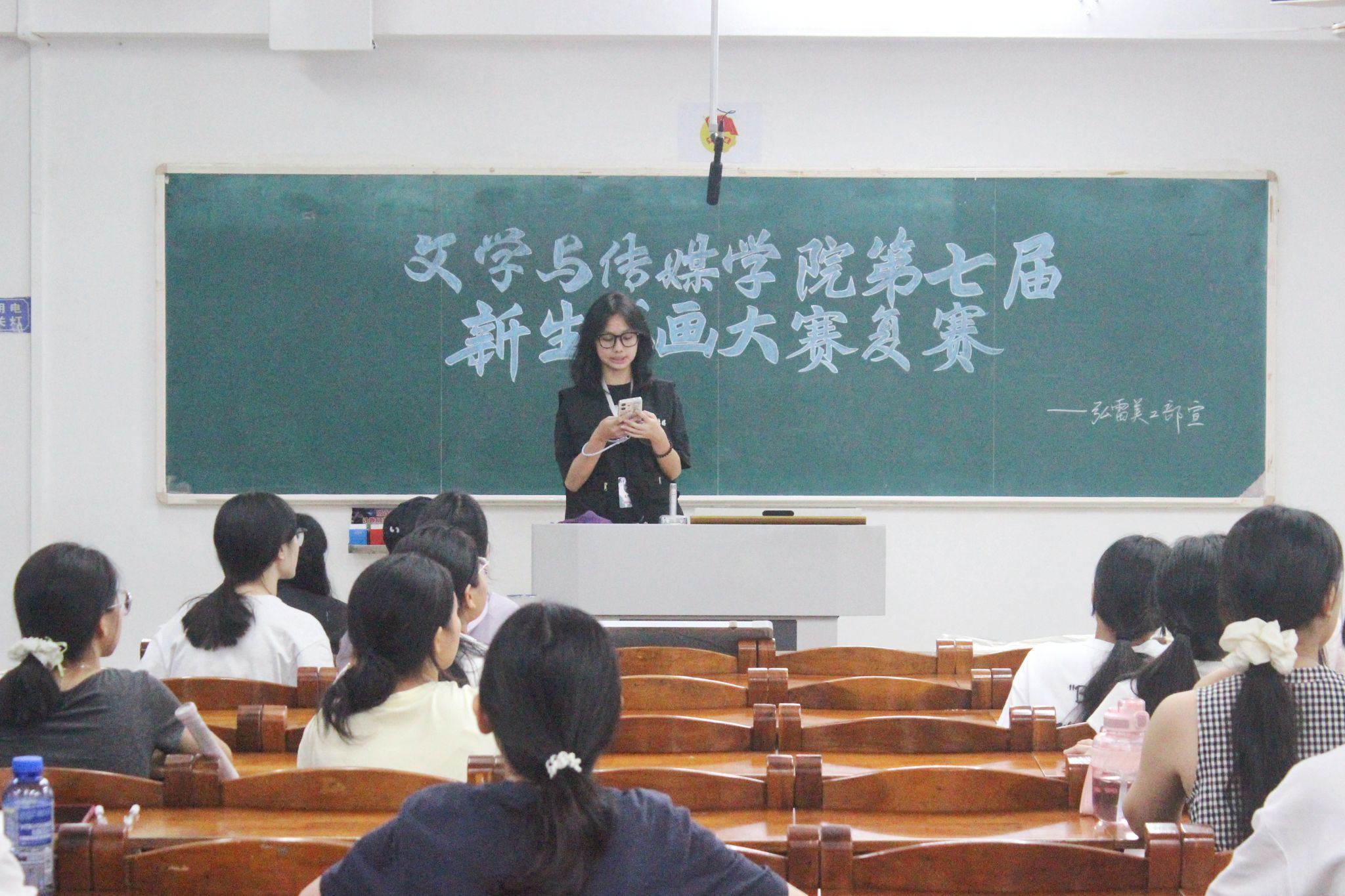 金秋十月,为激发学生对书画艺术的热爱,培养学生的审美情趣并提高其艺术修养,2025年10月18日晚,文学与传媒学院于第三教学楼205举办了文传院第七届新生书画大赛复赛。