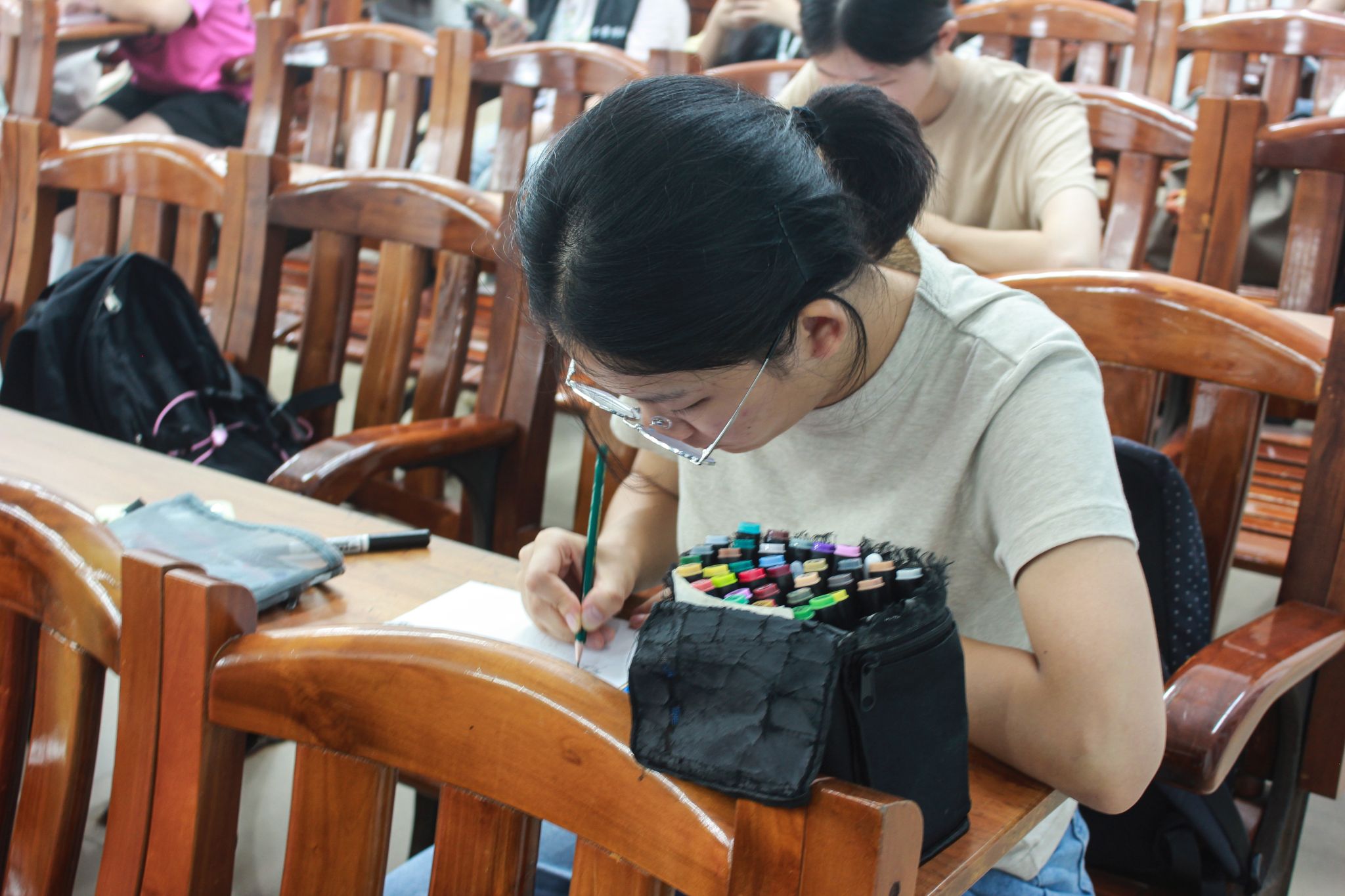 比赛进行时,在知悉比赛注意事项后,选手们迅速进入状态,聚精会神,用笔墨勾勒青春色彩。绘画组的选手们尽显创意与功底,用画纸与色彩碰撞出别样的火花;硬笔组的选手们则严谨细致,将汉字的方正与风骨展现得淋漓尽致;毛笔组的选手们比拼洋溢书法魅力,墨迹如行云流水般自然。摄影部的工作人员也投入工作状态,用摄像机记录下选手们创作时的精彩瞬间。