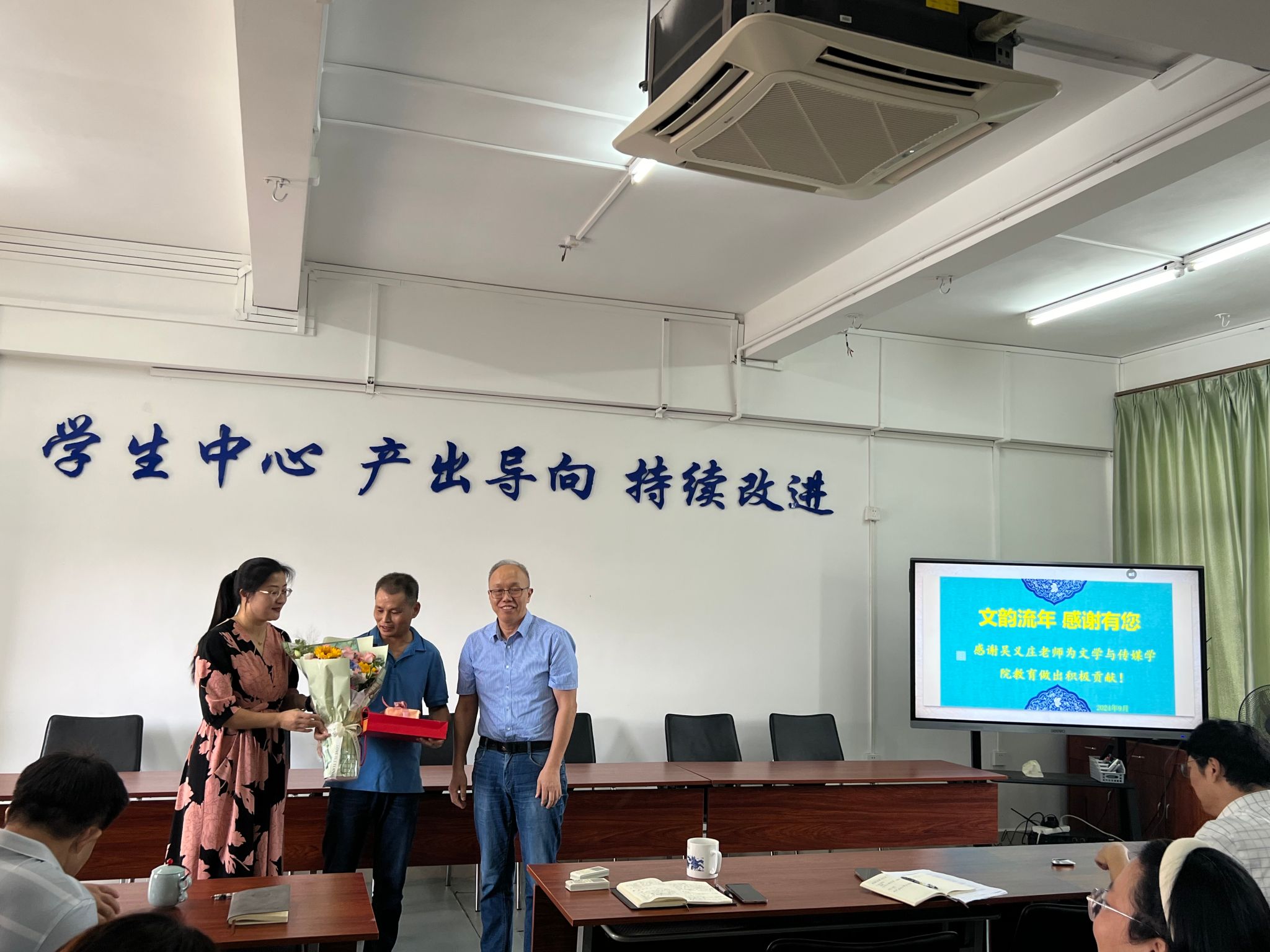 仪式上,陈凯珍书记为吴义庄老师送上了鲜花以及荣休纪念品。她高度赞扬了吴义庄老师的工作能力,感谢他从2008年开始与文学与传媒学院携手走过的峥嵘岁月。回首执教生涯,笑看桃李芬芳。吴义庄老师也感慨万千,追溯教育生涯的十六年,他一直担任办公室主任一职,始终兢兢业业,把学生的成长、学院的发展放在心上,为学校教育事业的蓬勃发展贡献自己的一份力量。最后,他满怀深情地表达对学院的感谢,衷心祝愿学院越办越好,培养更多的卓越人才,为教育界输送更多高质量教育者。