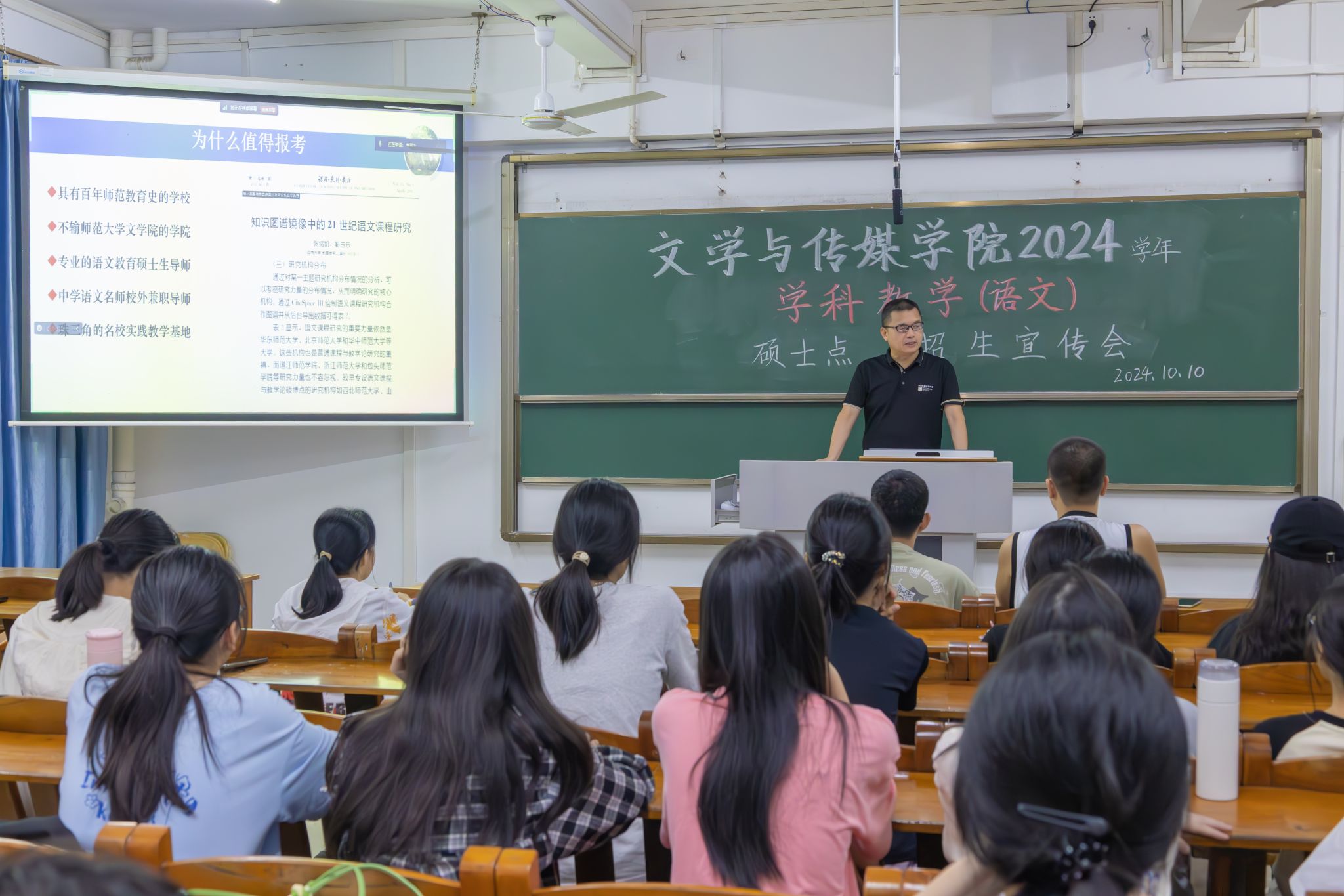 为了让全国广大考生更好了解岭南师范学院文学与传媒学院学科教学(语文)硕士招生专业方向及相关报考事宜,文学与传媒学院于10月10日在第三教学楼502教室召开学科教学(语文)硕士点招生宣传会。本次会议采取线上线下同步宣讲的模式进行,由文学与传媒学院副院长李斌辉教授作主要宣讲人。