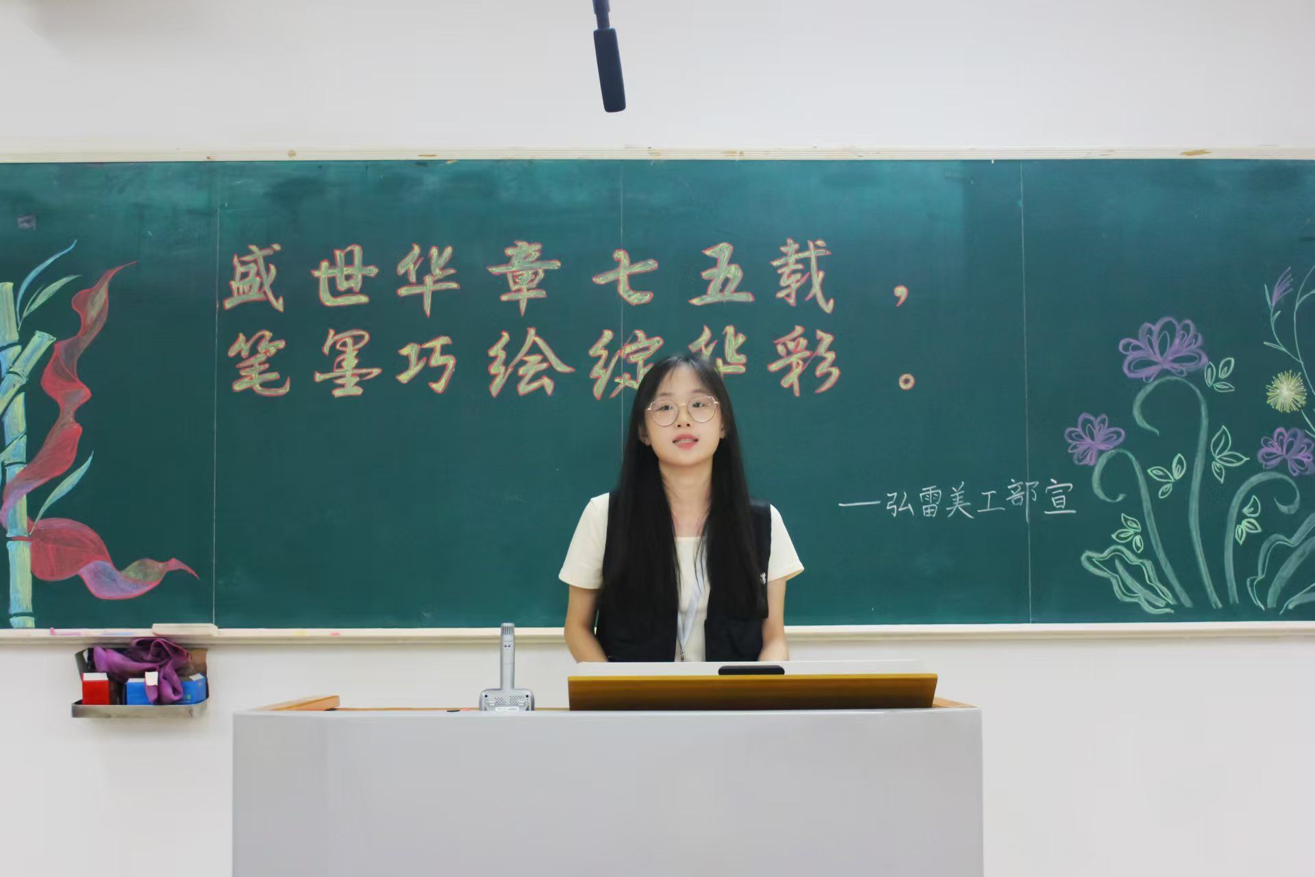 比赛开始前,美工部干部对场地进行了精心布置,选手们陆续进场,等候比赛开始的号令,随后主持人致辞并宣讲比赛规则。经过初赛的选拔,分别有硬笔组30人、毛笔组5人以及绘画组9人,共44名新生脱颖而出,进入复赛。本次大赛以“盛世华章七五载,笔墨巧绘绽华彩”为主题,庆祝中华人民共和国成立七十五周年。