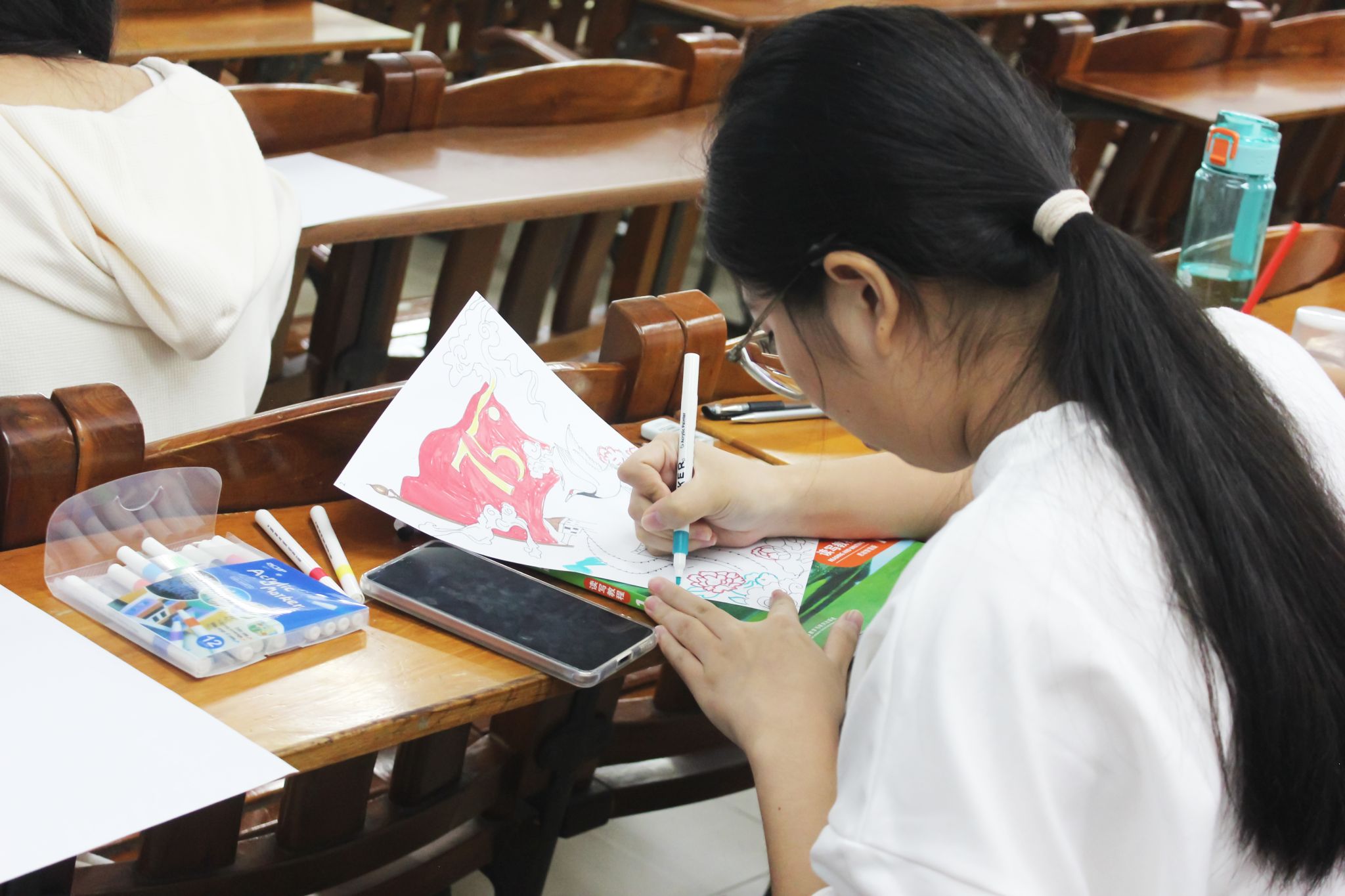 比赛伊始,相关工作人员下发比赛用品,并再次强调比赛时间、作品要求、比赛编号等。在知悉比赛题目以及相关要求后,参赛选手屏息凝神,全神贯注,迅速进入状态。硬笔组的选手们,笔力遒劲,气韵生动,用手中的笔,写下祖国光辉的赞歌;毛笔组的选手们,用手中的毛笔,挥斥方遒,笔下是对祖国毫不吝啬的赞美;绘画组的选手们,五颜六色的颜料在选手的手中逐渐形成一幅幅美丽的图画,试图画出祖国的绚丽多彩。各组选手用不同的方式,描绘着自己心中的那个祖国,以表达对中华人民共和国成立七十五载的欣喜与自豪。