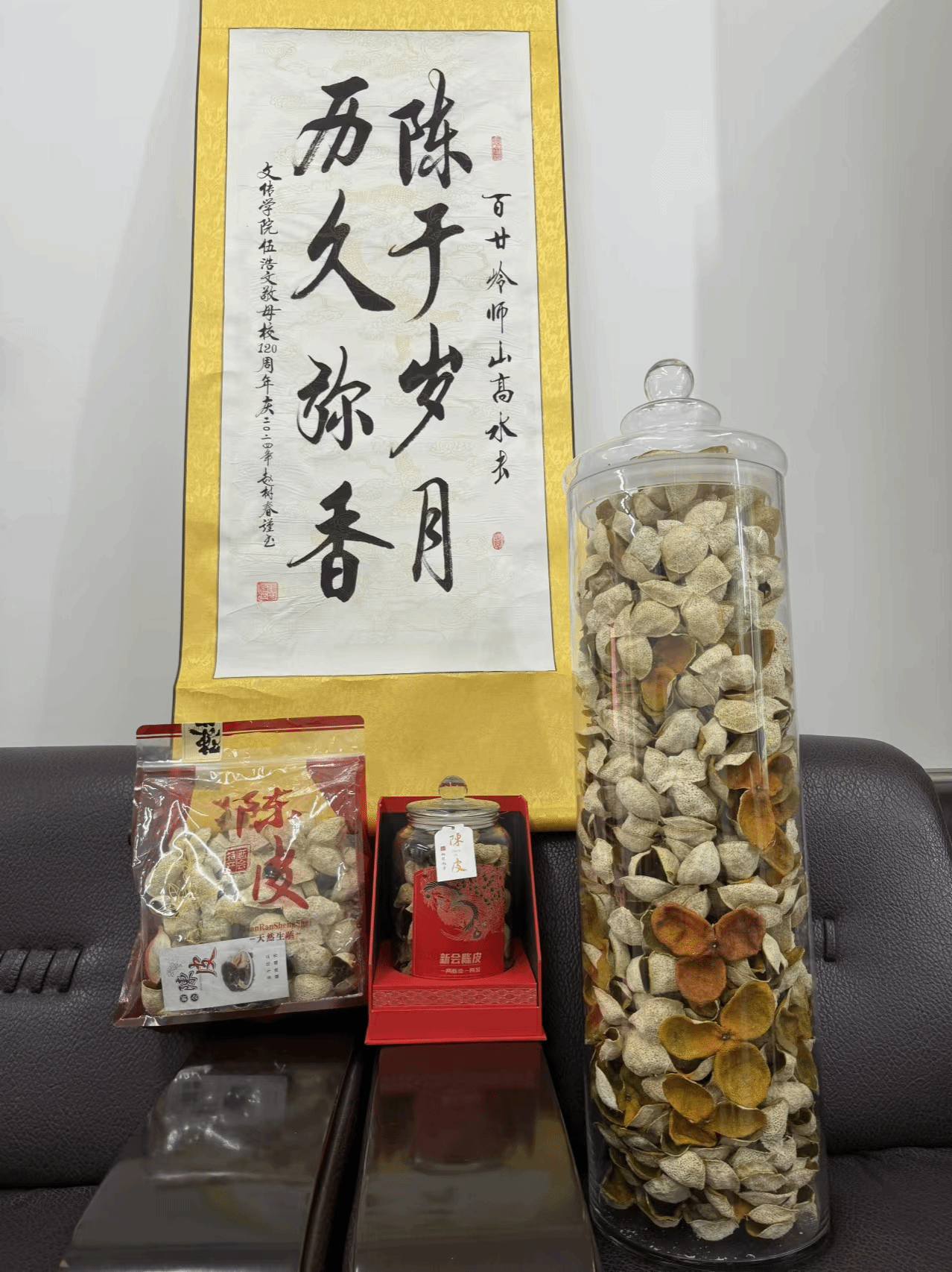 在广电班的毕业宴上,姚远老师的一句话:“做一位怀有宏观格局和微观细节能力的人”,深深地烙印在伍浩文的心中,对他后来的工作和生活产生了深远的影响。此外,林春大老师也是他人生道路上的重要导师,在工作和职业规划上多次给予他宝贵的指导。伍浩文十分感谢所教导过自己的老师和文传学院学工办的领导老师们,是他们为他的成长和发展提供了坚实的后盾。心怀感恩的他没有忘记母校和老师对他的培育之恩,在母校120周年校庆到来之际,为学院送上了一份厚礼——陈皮。这是12月初伍浩文亲自从茶枝柑树上摘下来的柑果天然生晒而成的新皮,泡水喝对身体有很好的功效。另外,陈皮会在岁月变迁中慢慢转化,越陈越香,也象征着百年岭师会在时代的新征程中,越走越远,越飞越高。