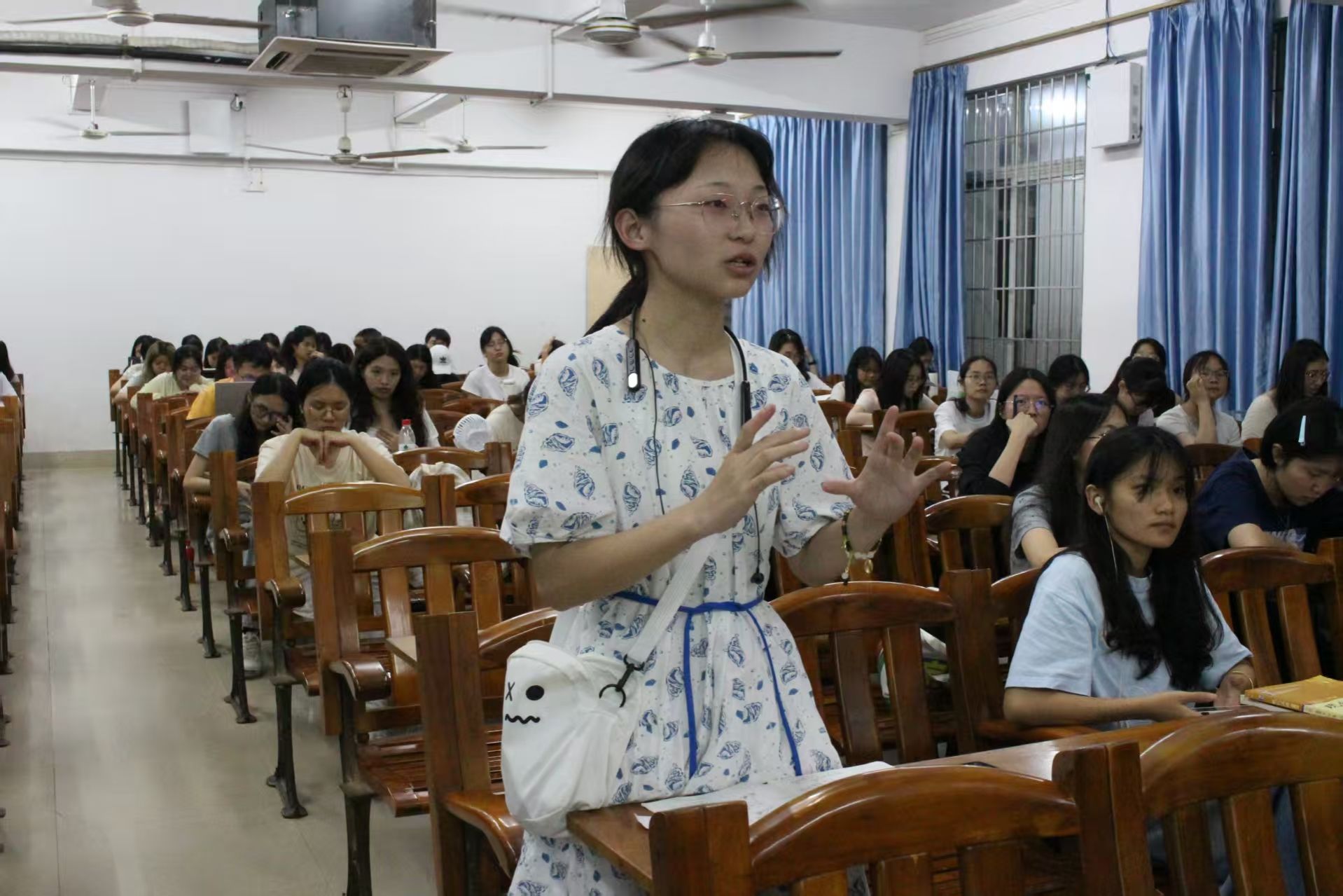 活动伊始,杨战朋老师结合自身的参赛案例,从选题、立意、讲解、标题、互动五个方面详细地介绍了大赛的流程以及自己的参赛历程,针对资料的提取,杨战朋老师以《短歌行》为例,通过剖析诗人的创作背景与情感脉络,构建清晰的讲解框架。他强调“以少总多,少而精”,要将诗词的独特性展示出来。关于讲解,杨战朋老师对此有独到的见解:“文学情感的可视化”,通过实体让评委观众对于诗词情感有着更加身临其境的了解。最后杨战朋老师勉励同学们:“实践出真知,只有实践才能战胜恐惧跟焦虑。”谈及诗词讲解技巧,陈子昕同学以“三到”为学子们支招:“一口到,讲解内容要紧扣核心观点,二眼到,要为评委与观众留下深刻的印象,三心到,升华主题引发评委观众的共鸣”。陈子昕同学还为大家分享了实用的参赛技巧,并细致入微地从神态、肢体等方面为同学们提供了参赛经验。针对大赛中常出现的错误,吴熙阳同学系统梳理了大赛的整体流程,她强调,同学们在备赛过程中要积极练习朗读讲解,多引用新颖的拍摄方式,考虑多种方法的切入,给评委和观众留下深刻的印象。