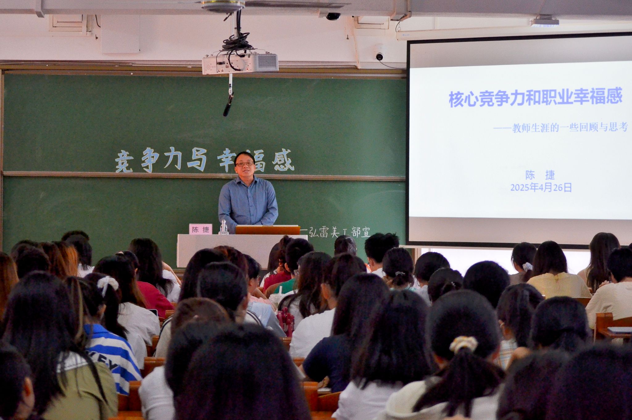 陈捷首先向在场观众抛出“什么是竞争力”“什么是核心竞争力”“什么是幸福感”“什么是职业幸福感”的问题,引发思考。他结合自身经历,围绕职业选择与实践,收获、挑战与转变,专业发展提升与人际关系应对,应聘实用技巧四个方面分享了自己的感悟与体会。他提到“如果在座的师弟师妹以后要从事教师行业,要思考自己需要具备什么能力”。对此,陈捷强调,最基本的是普通话的表达要清晰标准,语文教师必须要达到二甲以上的水平,如果有这方面的天赋或条件,可以多去参加朗诵类比赛,提高自己的朗诵水平,教师的朗诵水平也会影响学生的朗诵水平。他还提到三笔字的训练也至关重要,字如其人,他结合自己应聘和招聘的具体事例,生动形象地阐明一手好字可以为自己的职业生涯带来意想不到的机遇。不仅如此,还要注重自己的综合表现能力。应聘教师尤其要重视自身的备课讲课能力,面试的时间有限,想让评委眼前一亮,自己必须要注意一些细节,要清楚备课的课型与文体,了解教学重难点;试讲时落落大方,要注意与评委的眼神交流,与人对视时充满自信。当遇到人际关系方面的困扰时,他鼓励大家要以平和的心态相信自己,在观察与实践中不断提高自己的为人处世能力和情商。