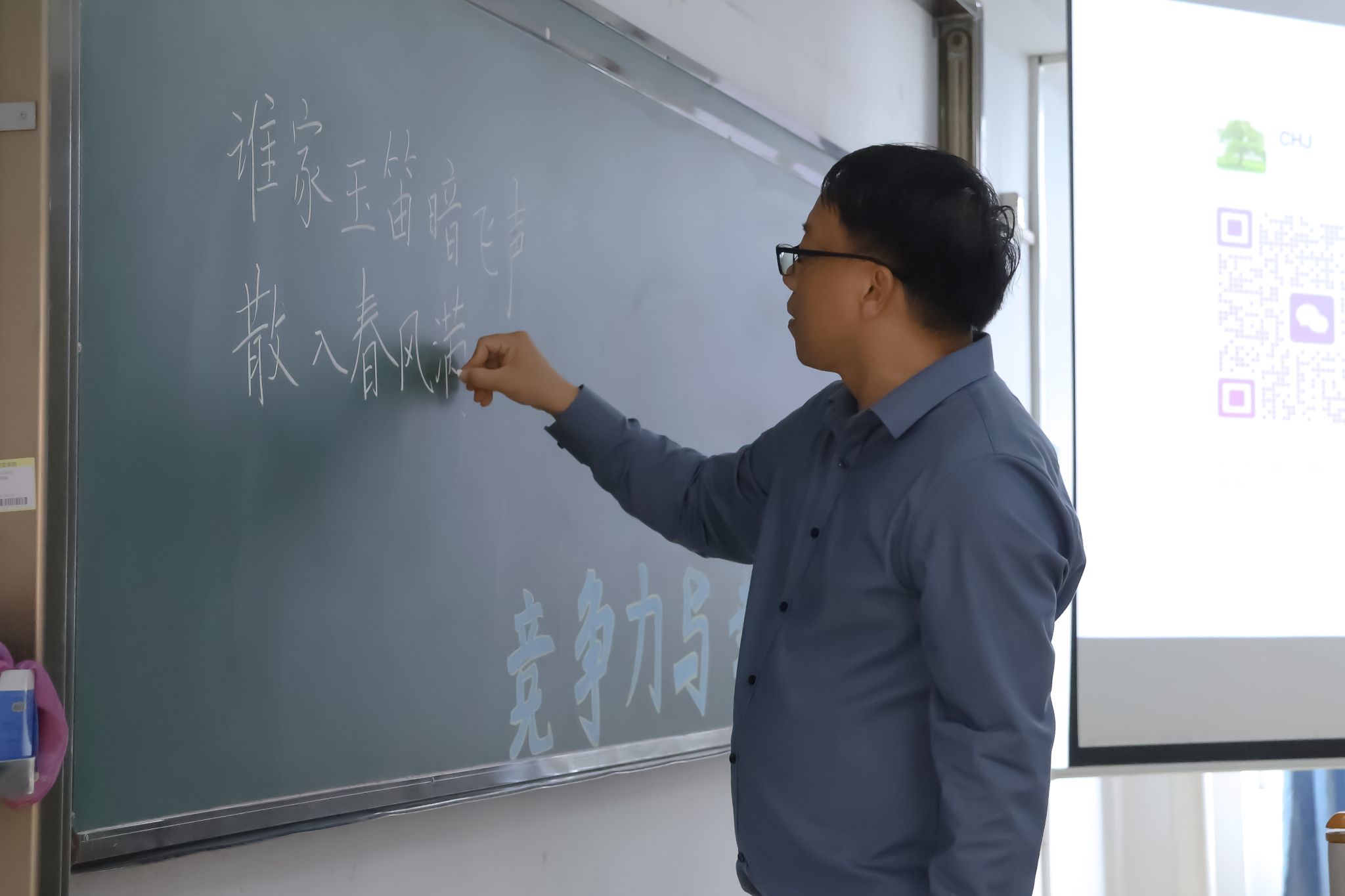 在互动环节,陈捷为同学们耐心解答了关于粉笔字训练的疑惑,并在现场展示了粉笔字的工整书写。在讲座的最后,他真诚地感谢岭南师范学院对他的培养,给予他底气。他希望,作为师范生的师弟师妹们能多走进真实的教学课堂当中,提高自己的教学和管理能力。