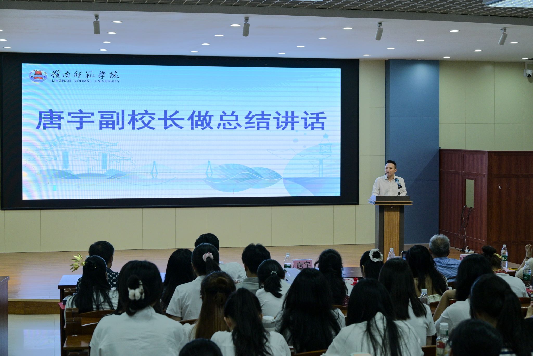 最后,唐宇副校长进行了总结讲话。他强调,学校始终高度重视与泰国高校之间的交流合作。自2006年与泰国皇家理工大学建立友好关系以来,双方互派近300名学生交换学习。今年恰逢中泰建交50周年,此次交换项目意义非凡,为“中泰一家亲”的深厚情谊注入了新的活力,增添了绚丽光彩。他高度评价了泰国同学在岭师两个月的学习生活,称赞他们不仅充分享受了学习时光,深切领略了中华优秀传统文化的魅力,汉语水平也的得到显著提升。这次活动的圆满举办与学校国际交流与合作处的统筹协调和以及文学与传媒学院等相关部门和教师的精心组织密不可分。唐宇副校长对交换生们也寄予厚望,希望他们以岭师校友的身份,成为中泰两国文化交流的友好使者,未来积极推动两校间的交流与合作迈向新台阶。