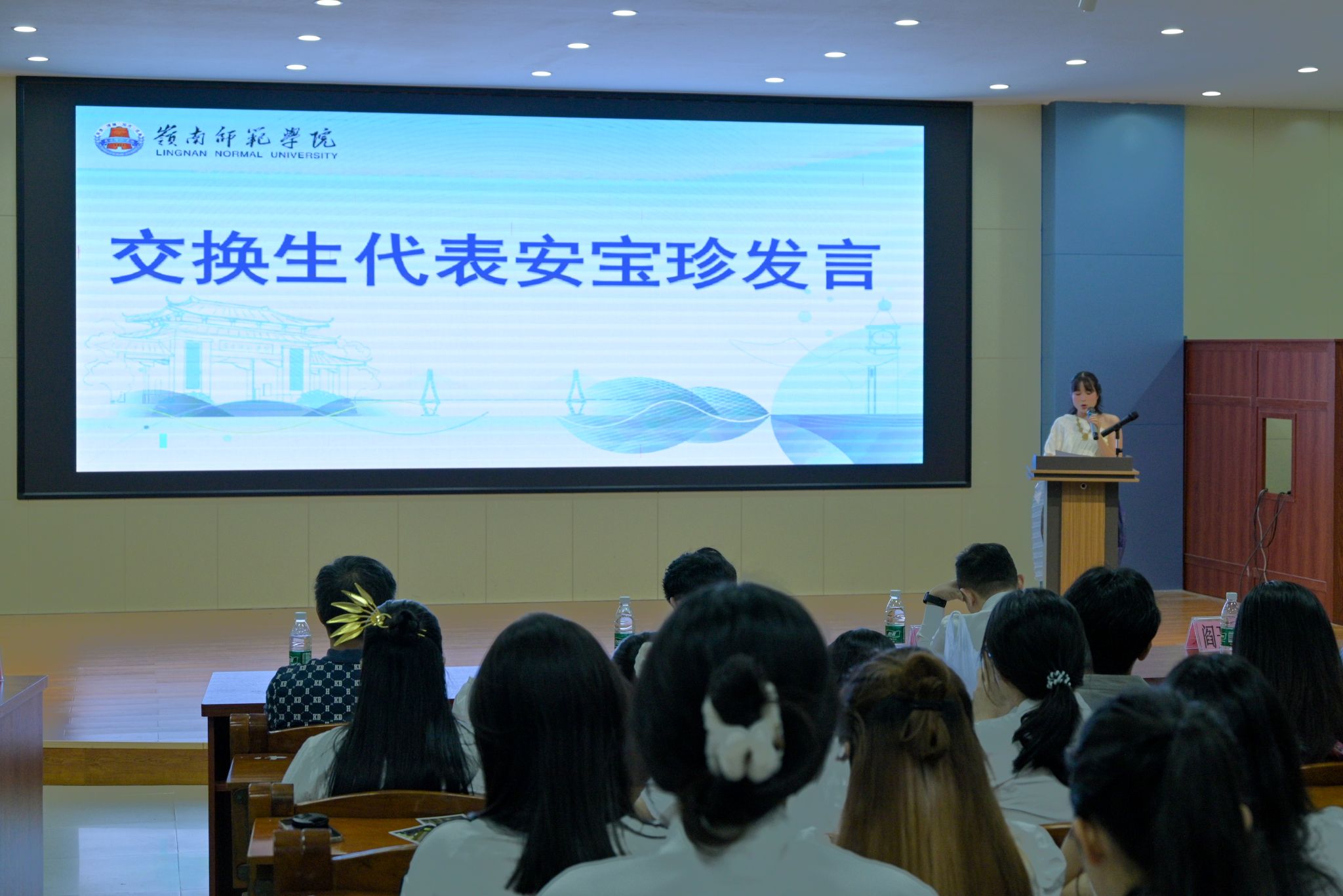 在学生交流发言环节,泰国同学安宝珍作为交换生代表首先感谢了岭南师范学院对这次学习及交流活动的精心安排,让她和同学们有了沉浸式的语言学习一切,并且零距离地体验了中国文化。老师与同学们的热情打破了文化的隔阂,让她们感受到了温暖,学习和生活上的精心安排让她能更好地完成课程。最后,安宝珍同学再次对我校领导老师和同学们表达了真挚的感谢。