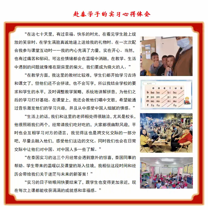 赴泰实习期间,实习队持续推出四期简报,成为了连接中泰、沟通校园内外的桥梁。每一期简报都实时播报着赴泰实习生活的点点滴滴,这些文字与图片,不仅是实习生活的珍贵记录,更让远在国内的师生、家长感受到海外实习的独特魅力。