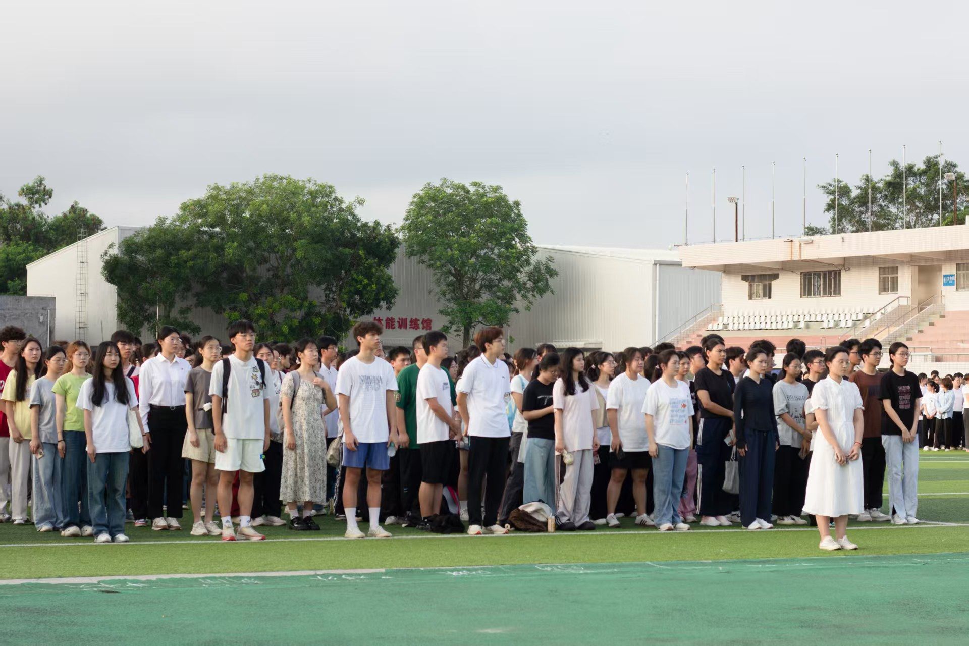 晨光微曦,校园镀上一层金色的轮廓,6月9日,文学与传媒学院于雷阳区田径场举行2024-2025学年第二学期升国旗仪式。学工办教师、我院学生共同参加活动。