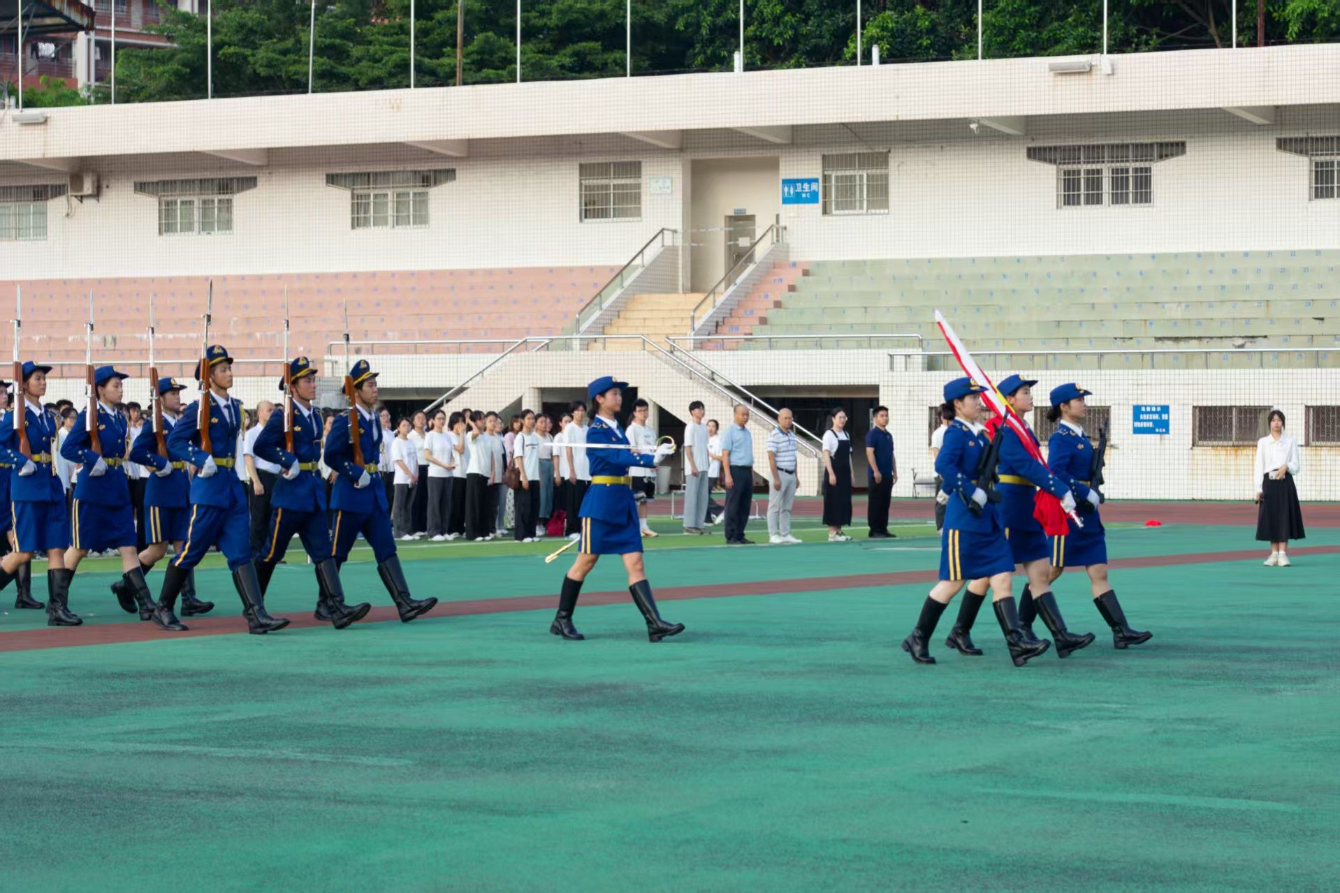 7点整,仪式正式开始。同学们队列有序地排列在操场上,随着指挥口令响起,校国旗护卫队迈着整齐划一的步伐,从主席台阔步而出。队员们身着戎装身姿挺拔,肩扛国旗庄严入场。