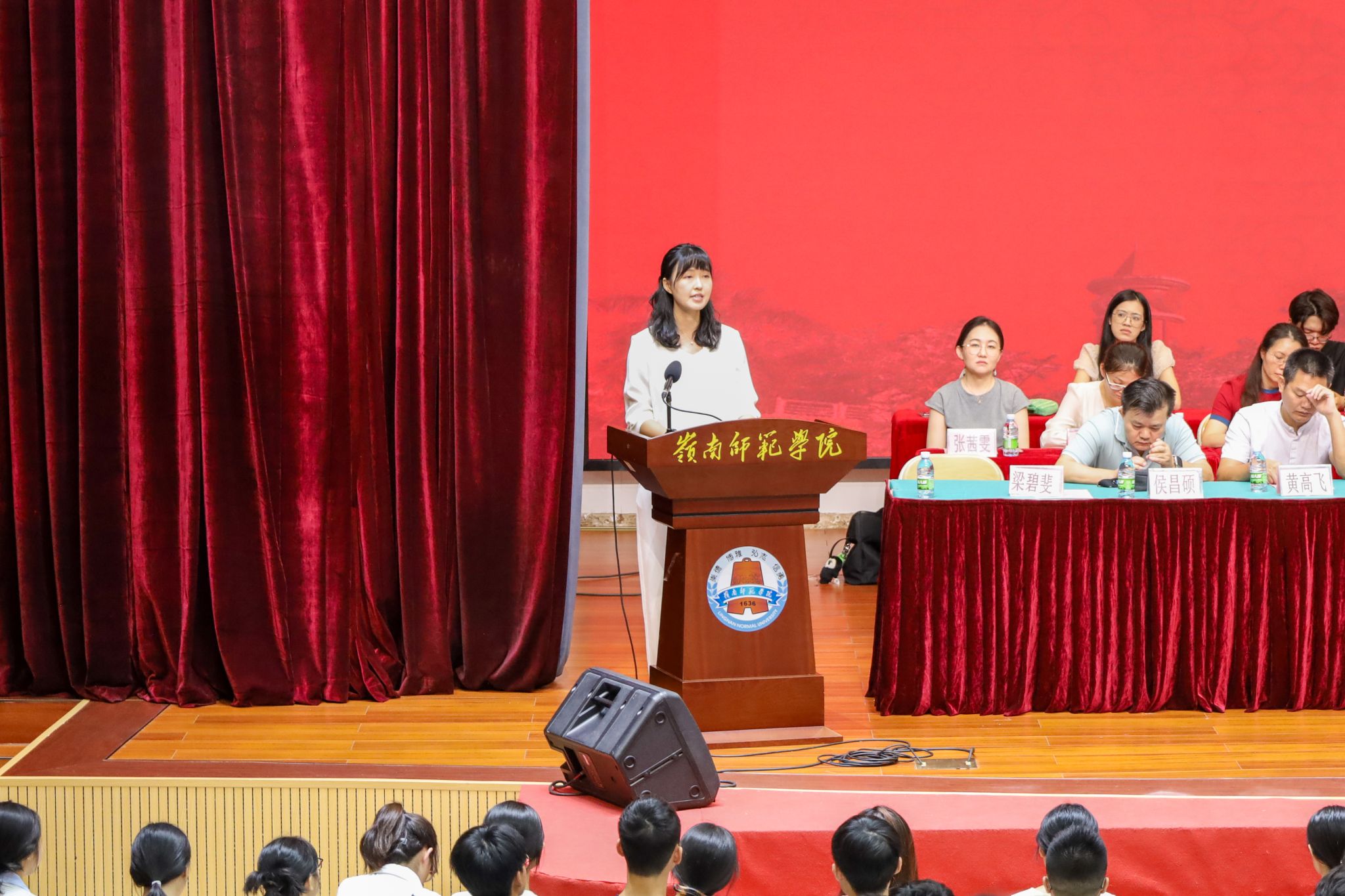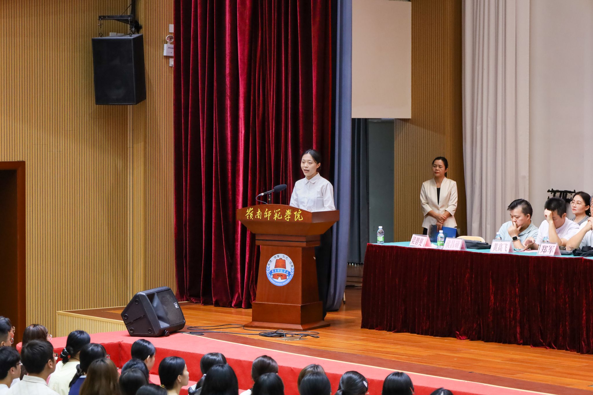 赵梓彤老师讲话(方睿 摄) 学生代表23级汉语国际教育班尹涵分享了自己在岭师两年的成长经历,她表示自己过去获得的荣誉都少不了学院的栽培。她鼓励新生珍惜学院优质资源,积极参与学院举办各类专业大赛活动,在实践中提升自我。