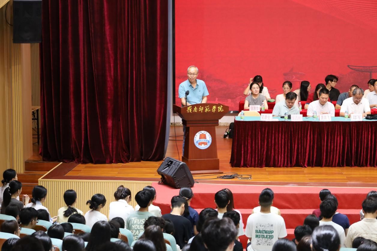 随后,阎开振院长向2025级新生致辞。他首先提到文传学院有着与学校同频的120余年办学历史,不仅拥有国家特色专业、国家一流本科专业等优质资源,校友更是遍布广东教育与新闻行业,更有国家级教学名师、劳动模范等杰出代表。同时还介绍学院办学规模——现有2500余名学生,80名教职工,其中16人任教授、46人具博士学位,师德标兵与省内外专家学者云集。在教学方面,学院精心制定了人才培养方案,全面实施导师制,积极开展第二课堂与实践实习,精心打造了以读书写、教研创为核心的专业素质与能力的培养途径,为社会培养了许多基础厚实、知识面广、综合素质好的有用、耐用与好用的人才。
