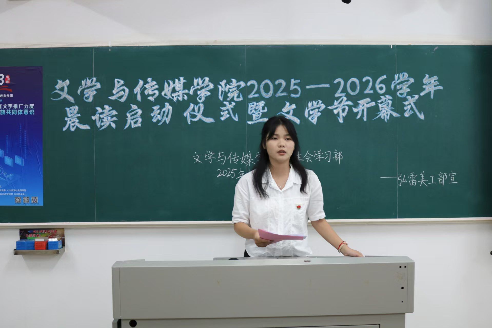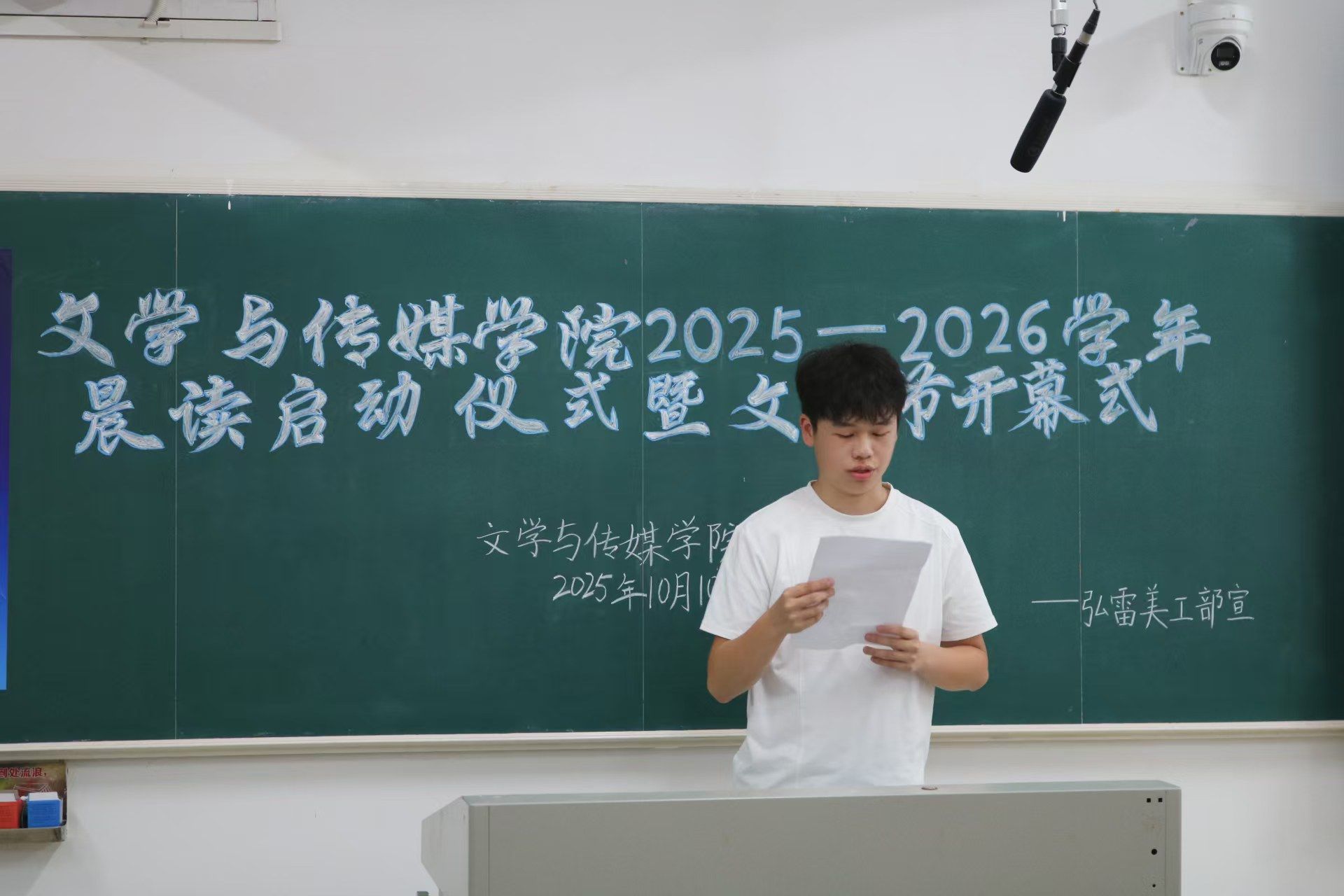 在本次开幕式仪式上,24级汉语言文学6班的余汉杰同学作为优秀学生代表向我们分享了其晨读感悟及学习经验。他分别从目标、心态以及同学间的共勉三个角度提出意见和建议,鼓励莘莘学子利用好晨读的宝贵时间,不断提升语言能力,让知识在心灵深处生根发芽,绽放出最绚烂的花朵。他诚挚地祝福25级新生能够携手并进,用勤奋与汗水书写属于自己的青春篇章。
