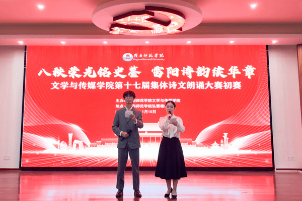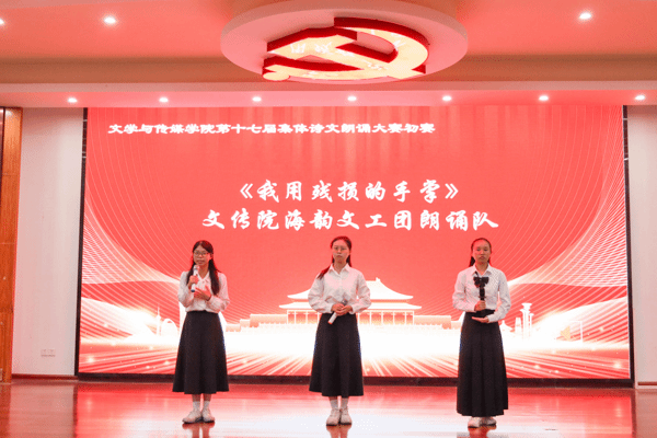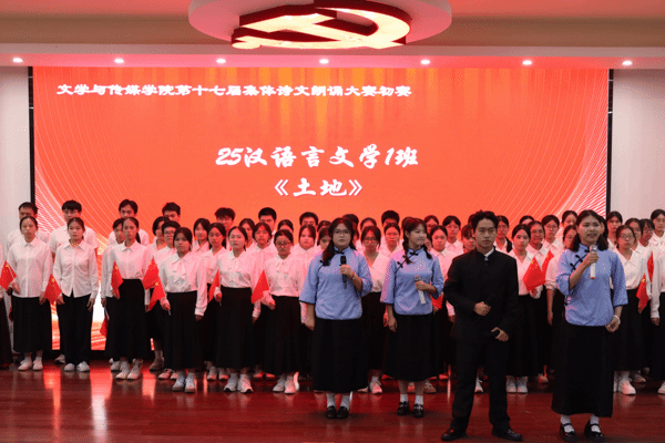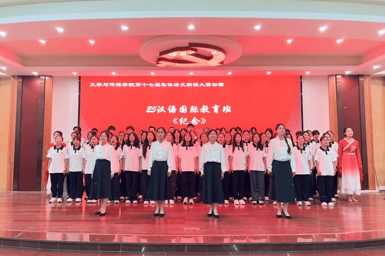 本次初赛共有18个班级参赛,24、25级汉语言文学、网络与新媒体、汉语国际教育、创意写作、新闻学等班级。他们以铭记历史、致敬先辈、赓续红色魂、礼赞祖国为主题,表达文传学子的家国情怀。其中24中本3班的同学们身子挺拔地列成方阵,齐声朗诵《雷阳印记,八秩回响》,将对先烈的缅怀与胜利的敬意揉进每句诗行中,让全场都沉浸在历史的厚重与家国赤诚中。25中本1班的同学们以小品的形式拉开序幕,他们铿锵有力地吟诵着《土地》,深切地凝望,把先烈们的抗战身影,徐徐铺展。25对外班的同学们整齐有力地朗诵着《纪念》,情绪层层递进,富有感染力,结尾配上一段戏曲加水袖舞为表演点上亮丽的一笔。