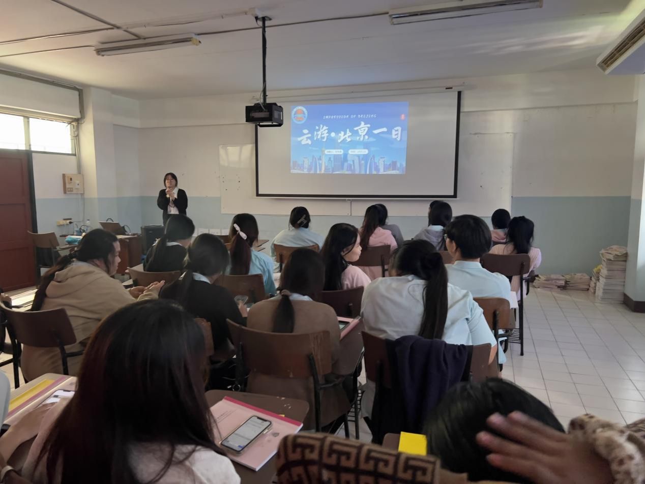 近日,岭南师范学院文学与传媒学院汉语国际教育专业牛冬琪,在泰国Daruna Ratchaburi Vocational College(达鲁纳职业学院)开展中文教学实习期间,为该校旅游专业二年级学生讲授了一堂别开生面的《旅游汉语》实训课。课程采用文传学院陆华老师自编教材,以“北京一日游”为主题,通过情境创设、文化融入与语言实践相结合的方式,有效提升了泰国学生的中文应用能力与跨文化理解,教学效果显著,获得泰国师生一致好评。