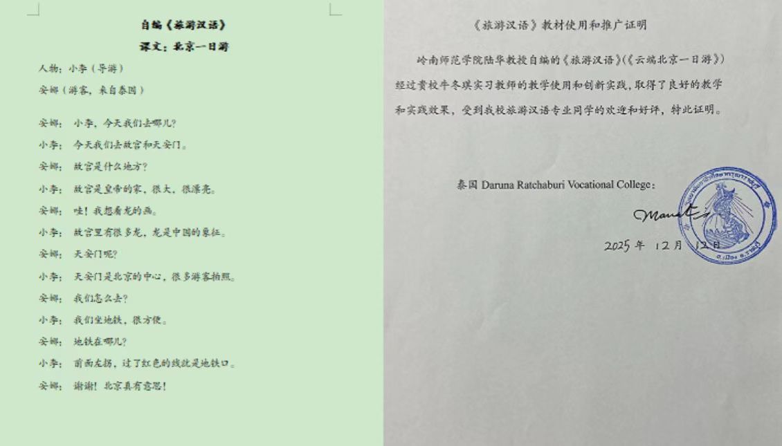 据悉,本次教学所使用的《旅游汉语》教材,由岭南师范学院应用语言学系主任陆华教授结合旅游职业需求与中国文化要点精心编写,兼具实用性、专业性与文化性,在本次海外教学中得到了有效验证。Daruna Ratchaburi Vocational College(达鲁纳职业学院)校长和泰方指导老师对课堂组织形式与教学效果给予了积极评价,认为此类以专业教材为依托、注重实战与文化传播相结合的教学模式,对培养旅游领域的国际中文应用人才具有示范意义。