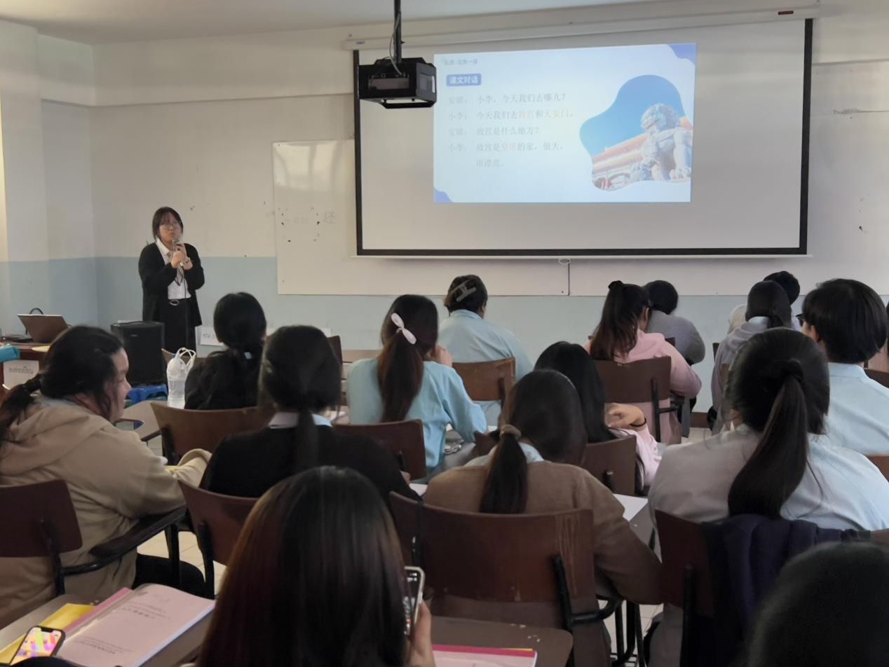 在课文教学环节,学生两人一组,分别模拟“中文导游”与“外国游客”角色,进行“北京一日游”情景对话练习。课堂气氛活跃,学生积极参与,在模拟带团的过程中体会中文导游的实际用语与沟通技巧。课程后半段,牛冬琪依托教材中的文化注释板块,对“故宫”的历史文化地位、“天安门”的象征意义以及“龙”在中国传统文化中的特殊内涵进行了生动讲解,并辅以相关短视频,使学生进一步领略中华文化的独特魅力,激发其对中国旅游与文化的深入兴趣。