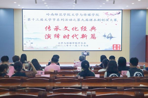 与经典同行,铺就人生底色;与时代同频,创造人生新篇。为进一步提高我校学子的文学素养,营造良好的读书氛围,在回忆文化经典著作的同时丰富我校学子的课余生活,为学子们提供自我展现的舞台与机会,岭南师范学院第九届课本剧创演大赛决赛于11月27日晚在弘雷楼511教室举行。本次以“传承文化经典,演绎时代新篇”为主题的活动由岭南师范学院文学与传媒学院学生会学生服务部承办。