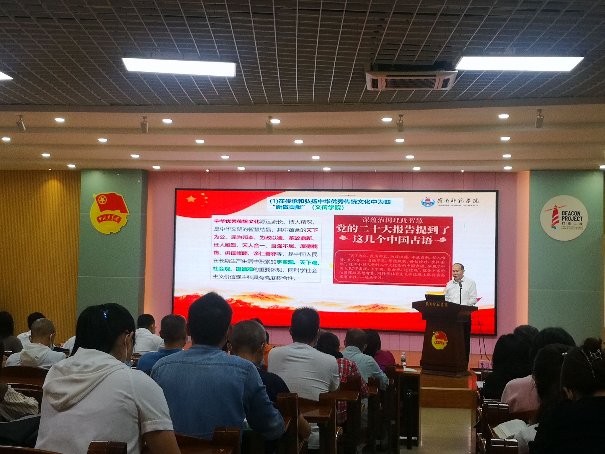 2022年11月23日,阳爱民校长以《认真学习贯彻党的二十大精神,为全面推进中华民族伟大复兴而团结奋斗》为题给文传学院全体教师宣讲党的二十大精神,促进了学院教职工将自身的思想和行动与党的二十大精神相统一,提升了学院教职工政治理论学习素养。