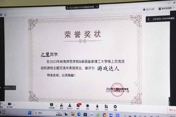游戏可以促进中泰双方学生的友谊,中泰双方同学于3月31日在第五教学楼A305教室开展了以“游戏”为主题的线上交流活动。活动伊始,汉教专业学生积极地为泰国同学演唱了一首《爱要坦荡荡》,以此来活跃现场气氛。随后,汉教专业学生向泰方介绍了“你画我猜”以及“谁是卧底”两个游戏的玩法,在示范一局后邀请泰方一同参与,泰方也积极响应邀请。两个游戏结束后,汉教专业学生采用了短视频、图片、文字等形式为泰方介绍了丢手绢、跳皮筋、老鹰抓小鸡、跳房子等中国经典儿童游戏。泰国同学林之慧以其积极、出色的表现获得游戏主题的奖项——游戏达人。