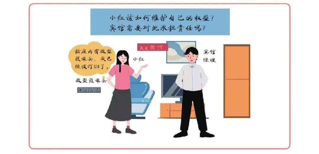 小红被公司派往A城出差。回到宾馆关灯准备睡觉时,电视机旁的插座引起了小红的注意。经过一番查看,小红在插座内发现了个微型摄像头。她立刻找来宾馆经理理论,双方争执不下,最后小红拨打了110报警。调查发现,房间内的摄像头是此前的房客老王安装的,宾馆对此并不知情。请问,小红该如何维护自己的权益?宾馆需要对此承担责任吗?