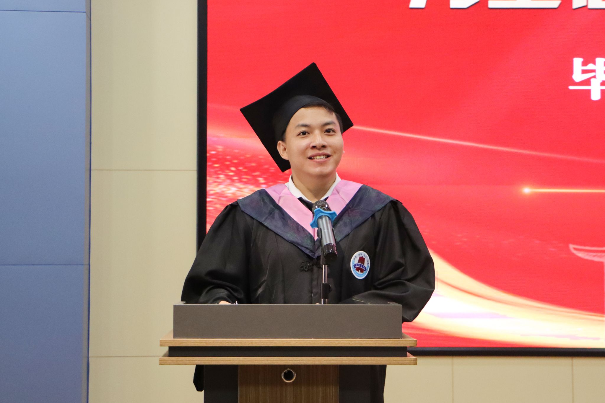 接着,19新闻学班郑泽浩作为毕业生代表进行了精彩的发言。他将发言浓缩为“感恩”“珍惜”“告别”这三个关键词,激励学子们珍惜过去,展望未来。对于即将离开校园的毕业生来说,此刻他们的心情是复杂的。他们不仅感慨时光飞逝,四年的大学生活一晃而过,也对未来充满了憧憬和期待,希望能通过自己的努力在职场或者创业的道路上获得成功,为社会做更多贡献。面对未来的不确定性,教师代表周显波向毕业生们提供经验和建议:对努力坚持,对成功佛系,对自己不焦虑;成功后关闭自己,失意后放过别人;相信文学,把文学魅力传递下去。“老师都希望你们成为日月,当然,成不了也没关系,做到心安、从容、有智慧就好了。”周显波老师的发言将是毕业生们今后宝贵的精神财富。文学与传媒学院全体老师对毕业班学生寄予深切厚望,希望大家能够带着这份良苦用心,踏浪而行,冲破所有被既定的曾经。