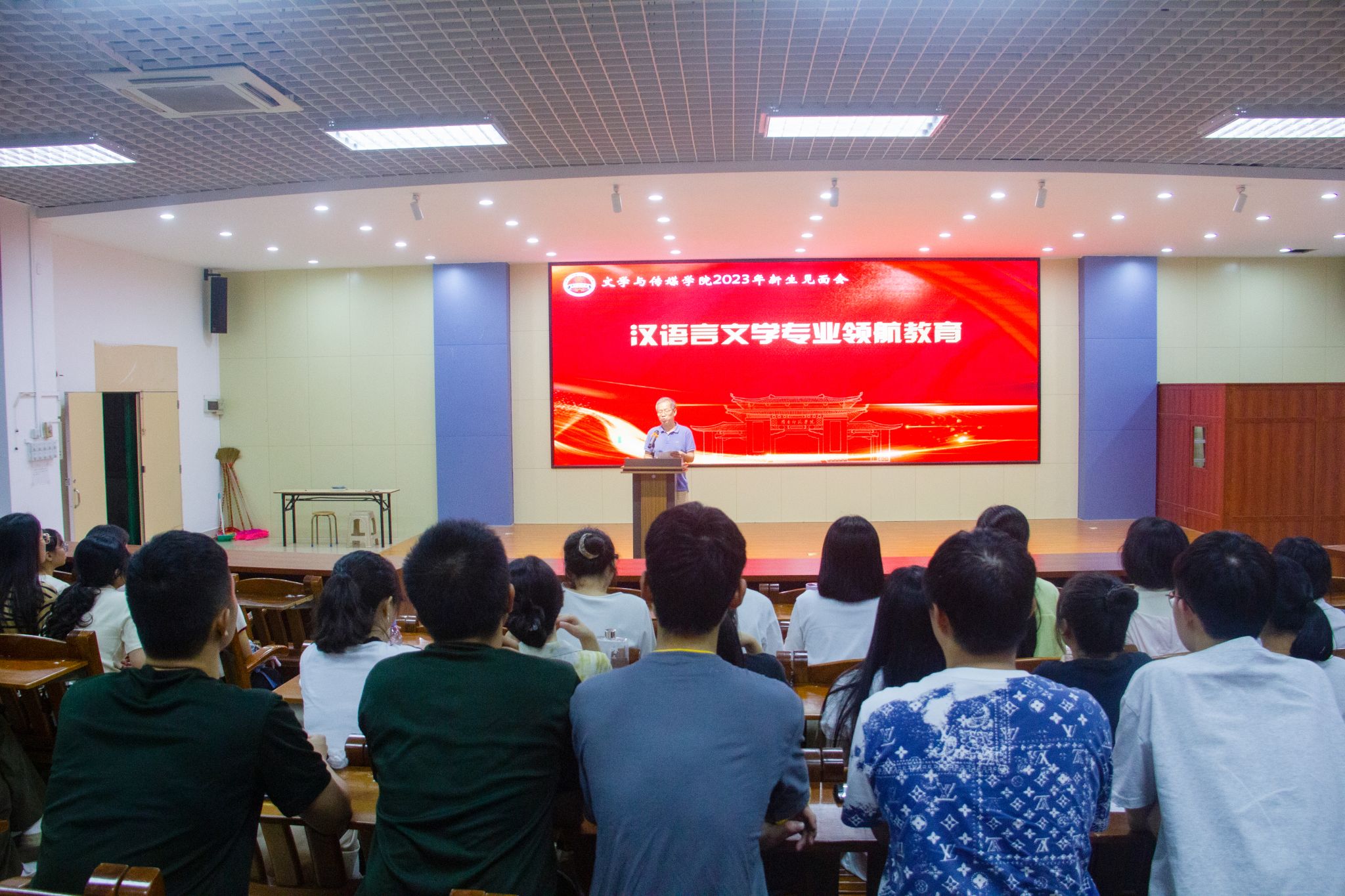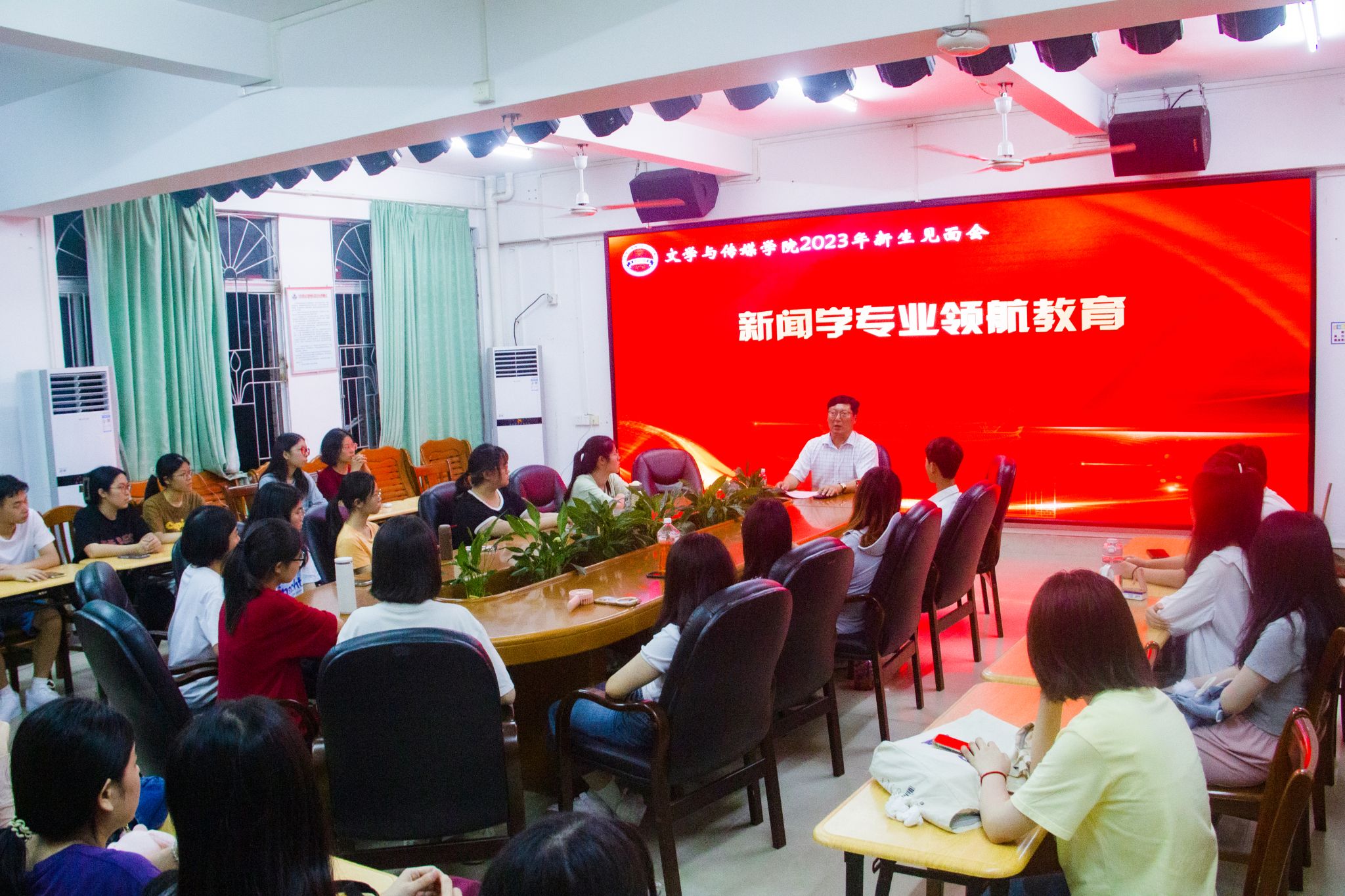 见面会结束后,文传学院更是开展了汉语言文学专业和新闻学专业的领航教育,有效地帮助新生们了解自己的专业。汉语言文学专业领航教育由王钦峰老师主持,他用幽默风趣的语言带领同学们回顾文传学院汉语言文学专业的发展历史,并向新生们介绍了汉语言文学专业的优秀校友、师资力量、科研基础和专业优势。同时,王钦峰老师向同学们讲解该如何学习该专业,一是要从最基础的做起,认真学好并做好自己的功课;二是要扎实教育实习、教学技能的基本功;三是要重视教育实习,反复学习如何教学。而新闻学专业领航教育则由姚远老师主持,他先是热情地向新生介绍了自己,拉近了与新生们之间的距离。接下来,他便向新生介绍了新闻学的发展状况和新闻学毕业生的就业情况,大大地提高了新生对专业的认可度;他也向新生们介绍了新闻学专业的相关课程,让新生们在专业学习上有了充分的认知。