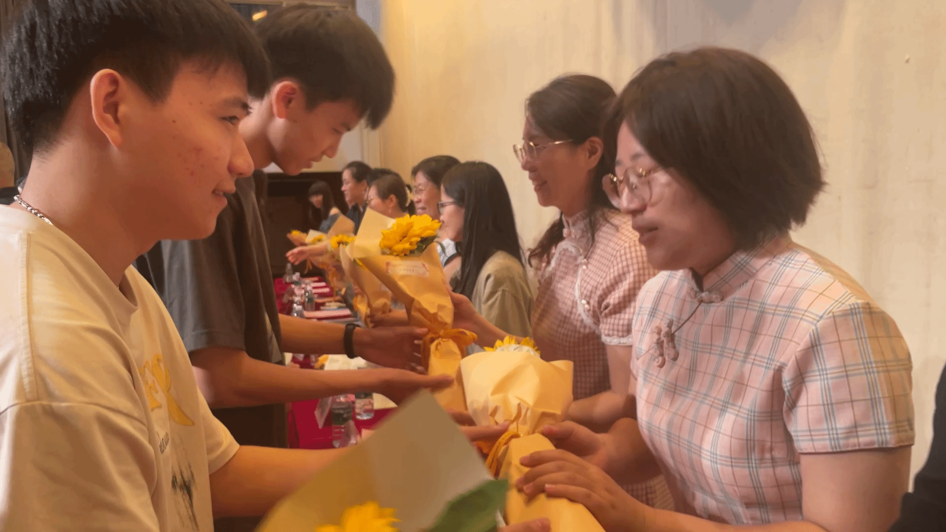 肩负梦的传承,以鲜花赠恩师。拜师礼完毕后,学生代表们手捧鲜花,面带微笑,整齐有序地走向老师,他们向老师深深地鞠了一躬,真挚地向老师们表达了无限敬意与祝福。老师们接过手中的鲜花,为学子们送上美好的祝福。朵朵鲜花,代表着文学与传媒学院学子真挚感激如春日的繁花,绚烂又满当;鲜花朵朵,寓意着文传学院老师的辛勤教诲如春日的繁花,为学院学子的生活增添无限色彩。