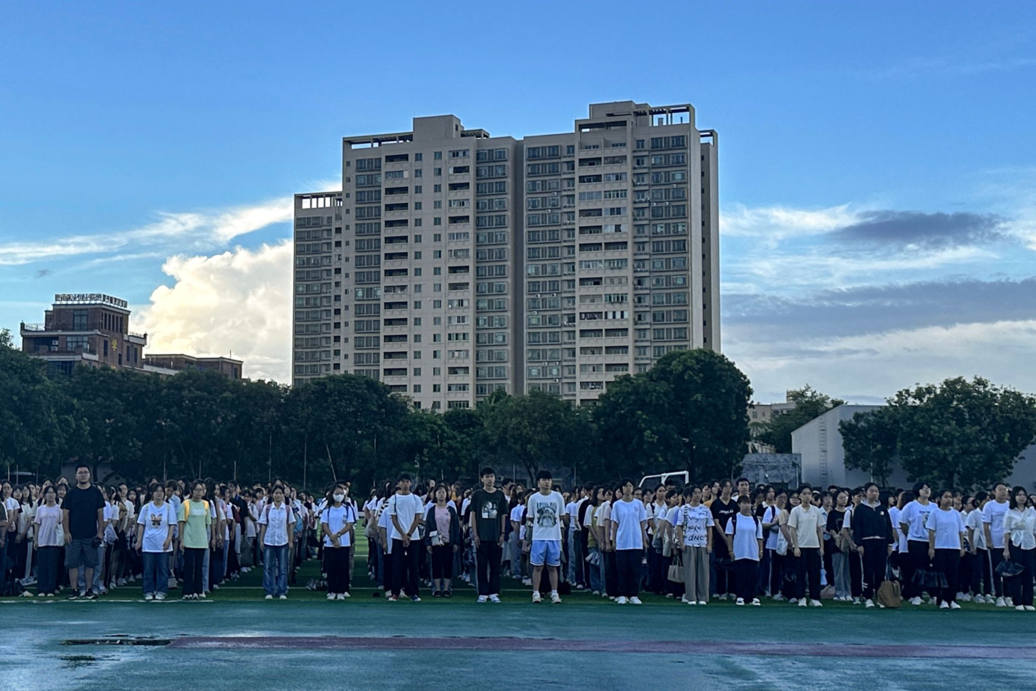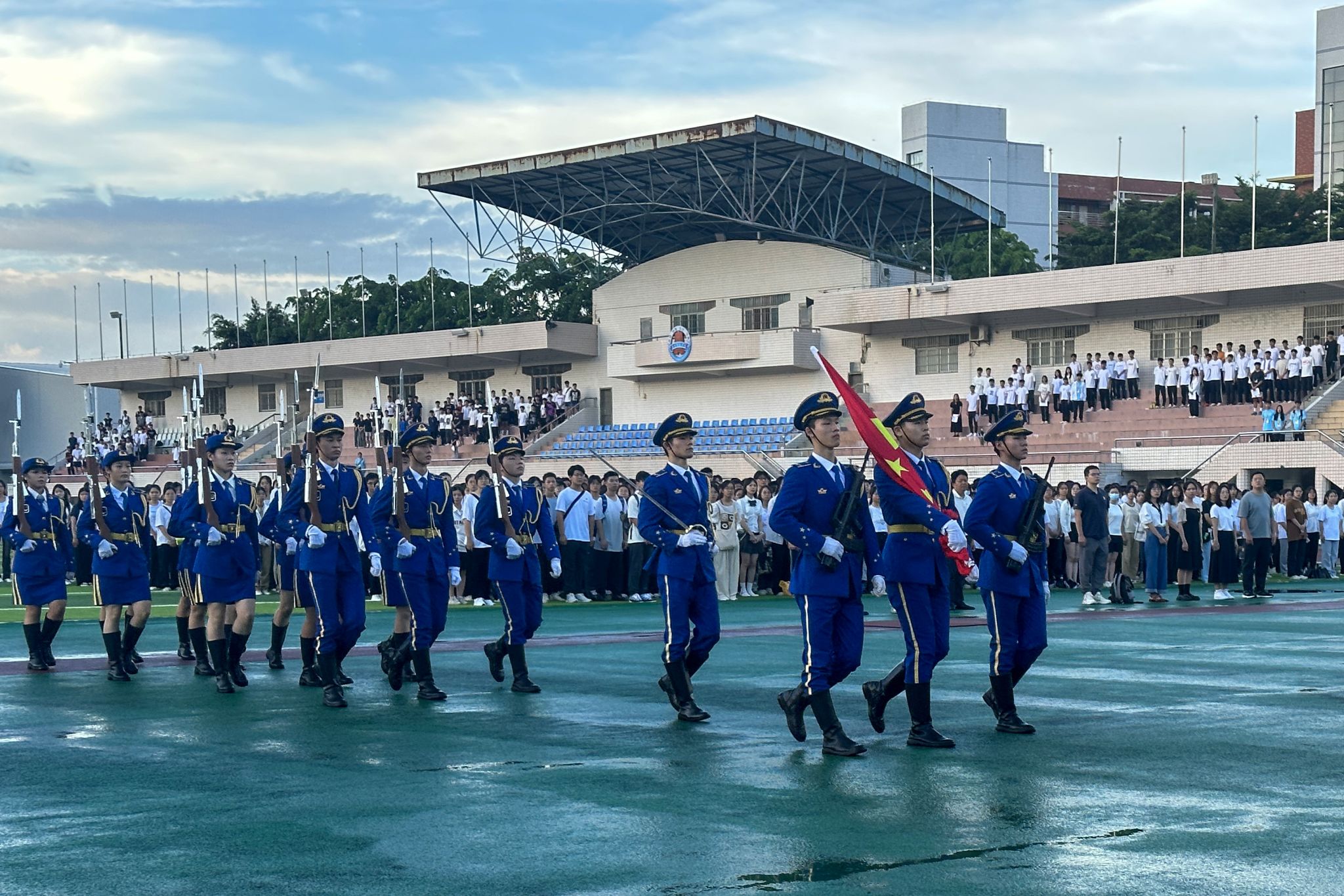 为弘扬爱国主义精神,培养爱国情怀,9月18日上午,文学与传媒学院于雷阳区田径运动场举行2023—2024学年第一学期升旗仪式,由2023级全体学生参加本次仪式。