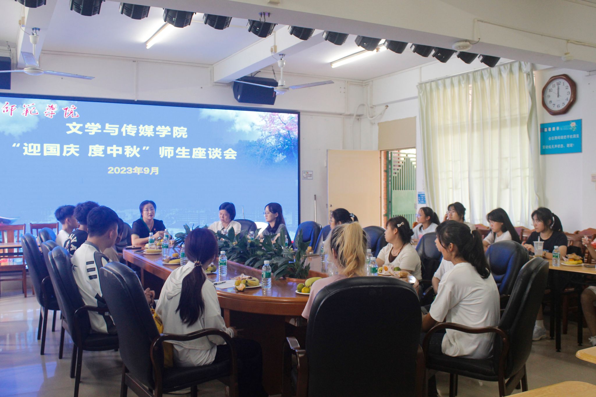 欢度中秋,共度国庆。为了持续在学院中营造民族团结的良好氛围,促进民族团结,9月25日,文学与传媒学院于第三教学楼四楼会议室召开了2023级“迎中秋 度国庆”少数民族座谈会。本次座谈会由2023级辅导员林苏红老师主持,学院党委陈凯珍书记、梁碧斐副书记以及文传学院2023级少数民族学生参加本次座谈会。在本次座谈会上,学院特为少数民族学生准备了岭南师范学院圆府酒店制作出品的月饼和应季水果,让同学们感受到了来自学院温暖。