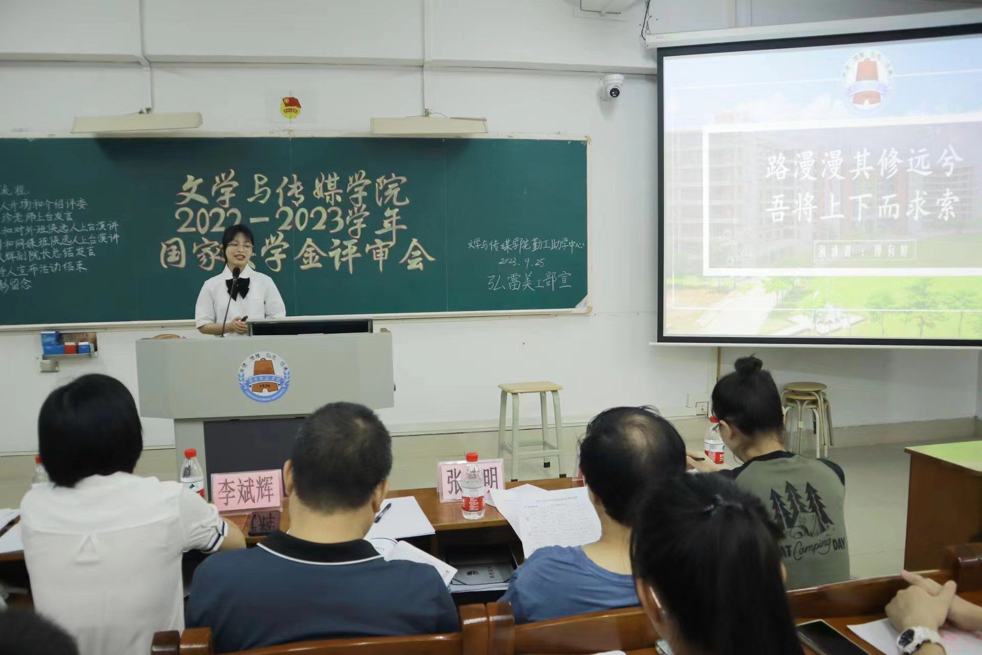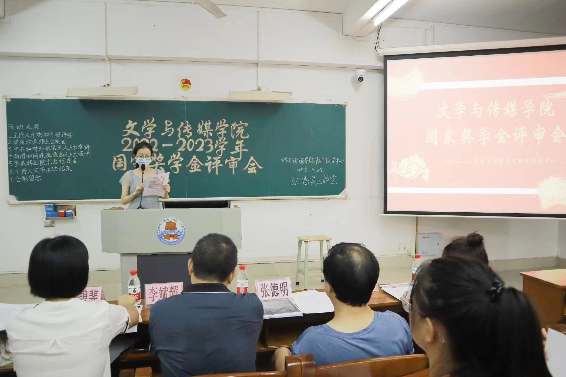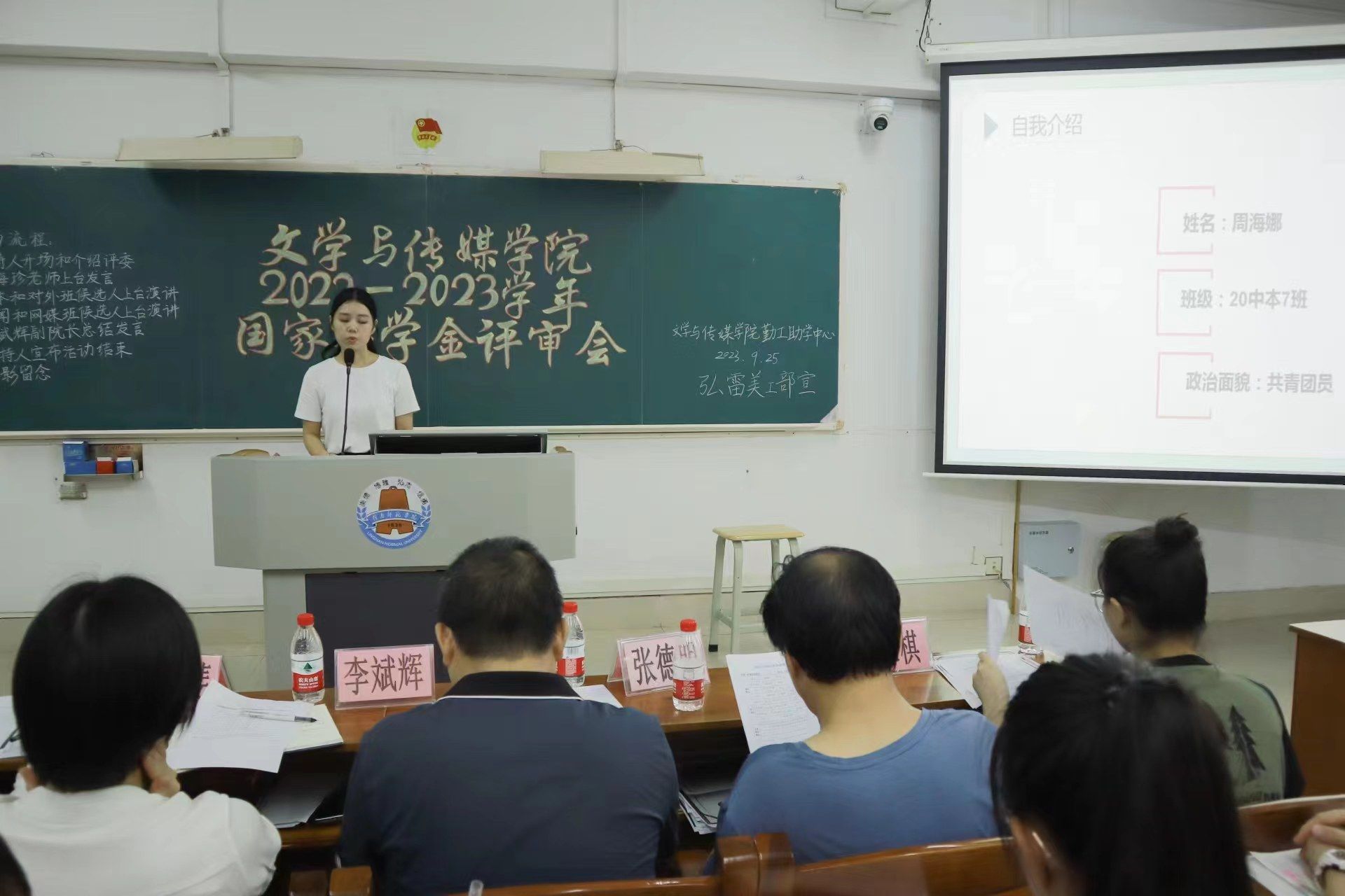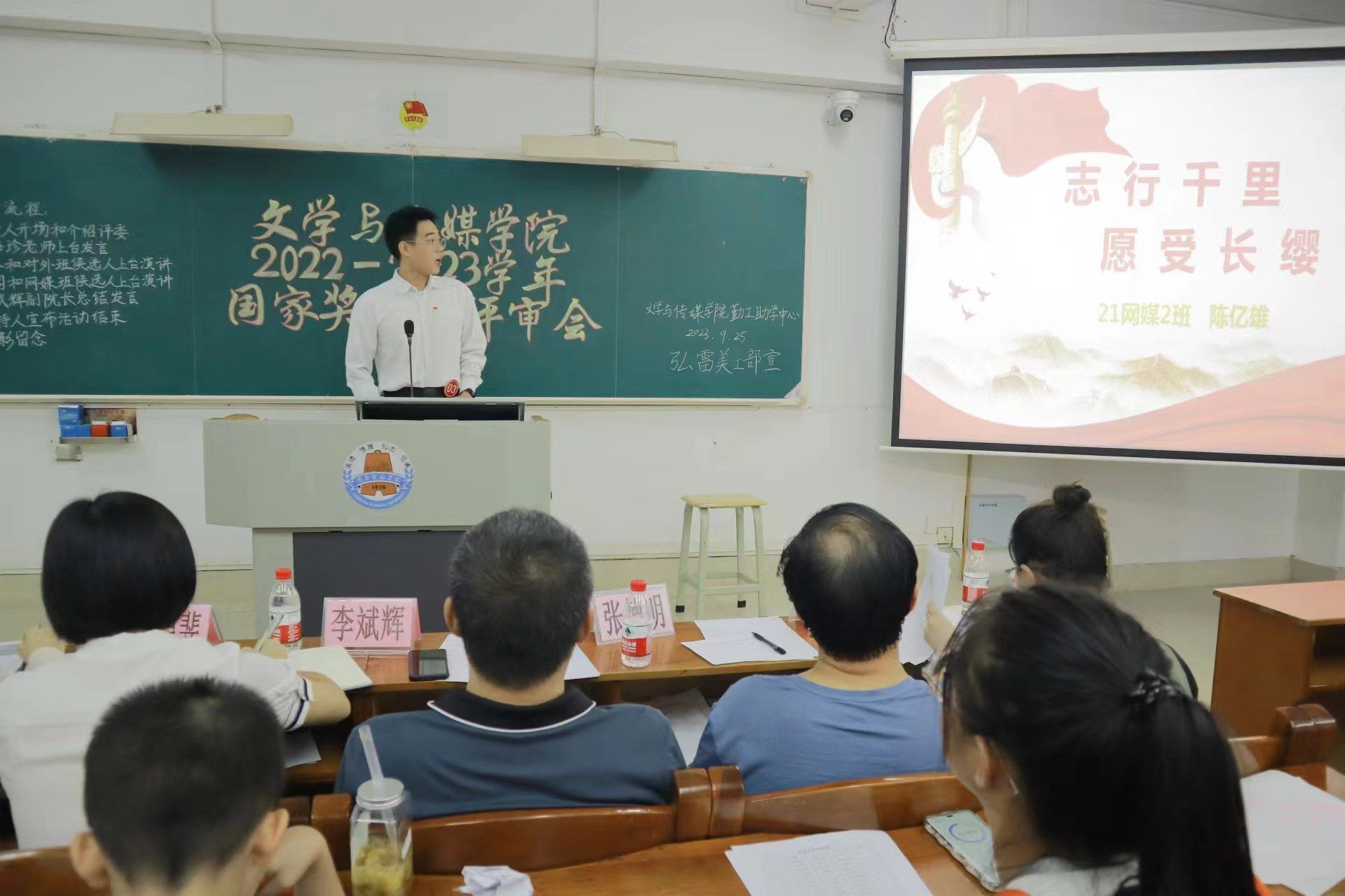 为充分发挥国家奖学金的引领与激励作用,奖助育人、表彰青春榜样,推进学院学风建设,鼓励学生向好向善向优发展,2022-2023学年文学与传媒学院国家奖学金评审会于9月25日晚在第三教学楼405室举行。出席本次评审会的领导嘉宾有文学与传媒学院党委梁碧斐副书记、李斌辉副院长、张德明老师、赵敏老师、梁海珍老师以及陈泳棋老师。