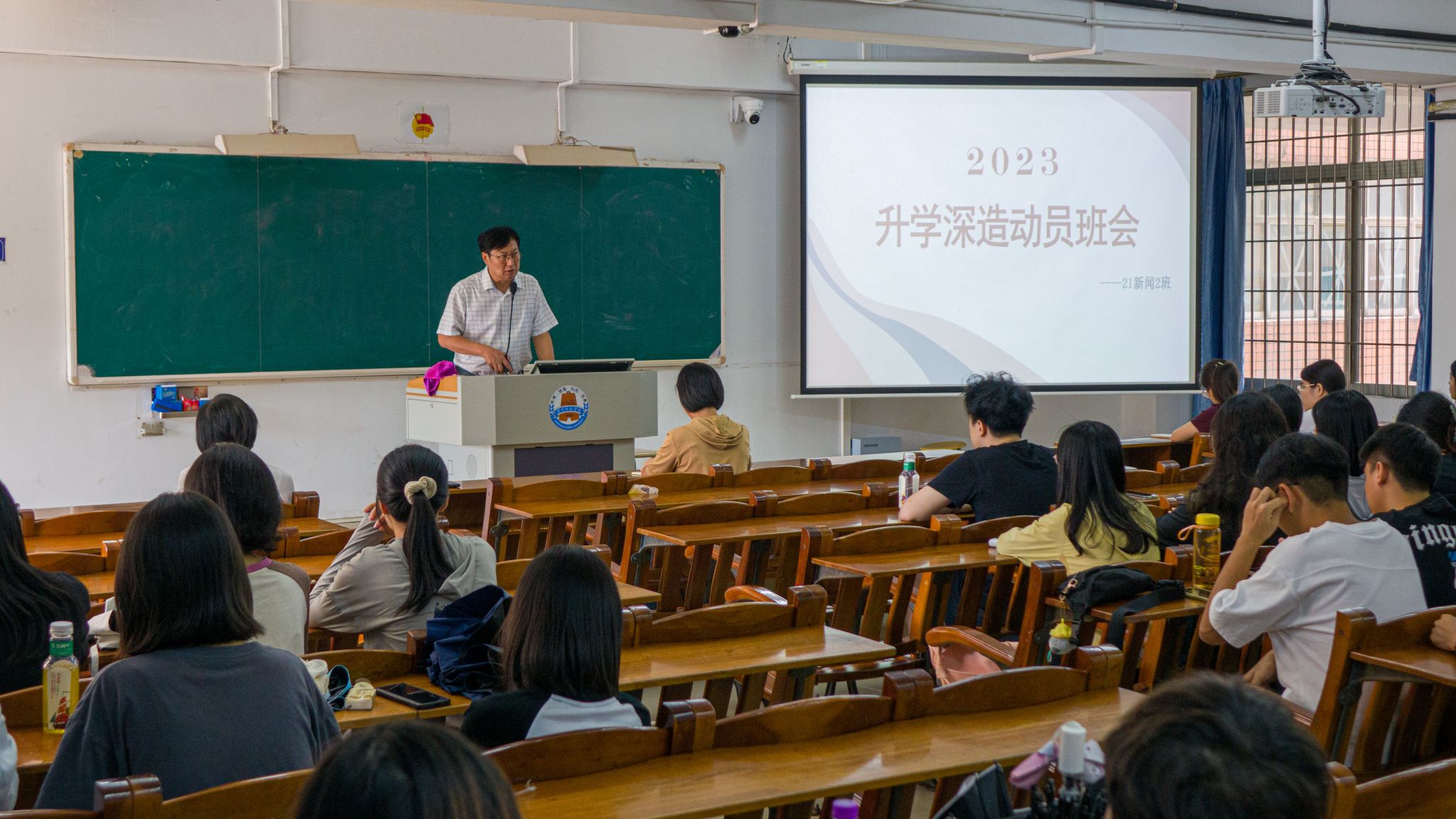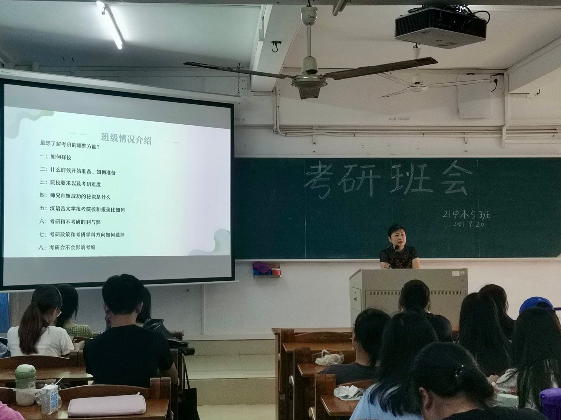 为了帮助2025届毕业生了解最新考研政策,正确认识考研形势,指导学生科学择校择专业、合理报考,文学与传媒学院于九月下旬在2021级各班级中开展升学深造动员班会。学院领导班子、班主任、辅导员出席各班主题班会。