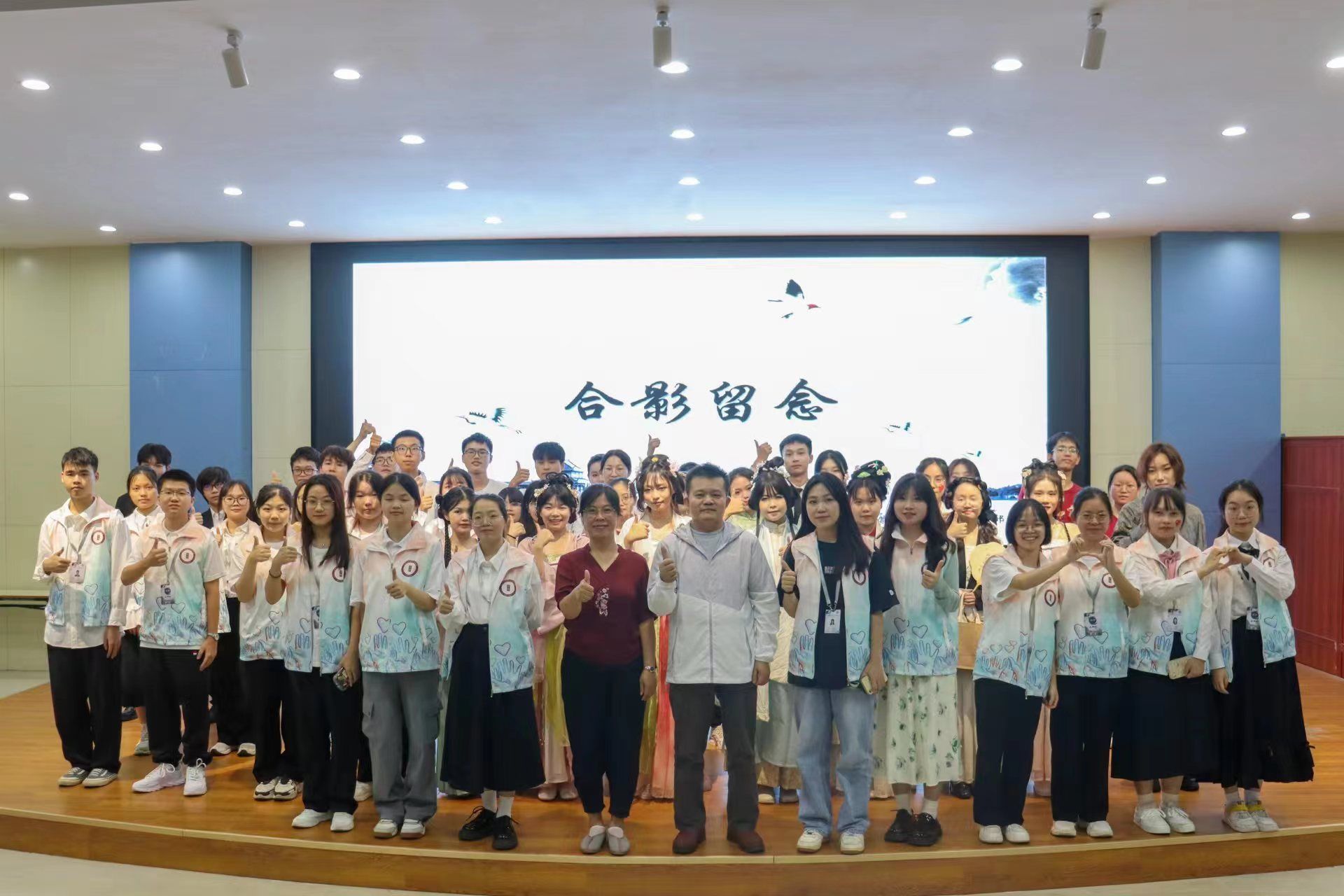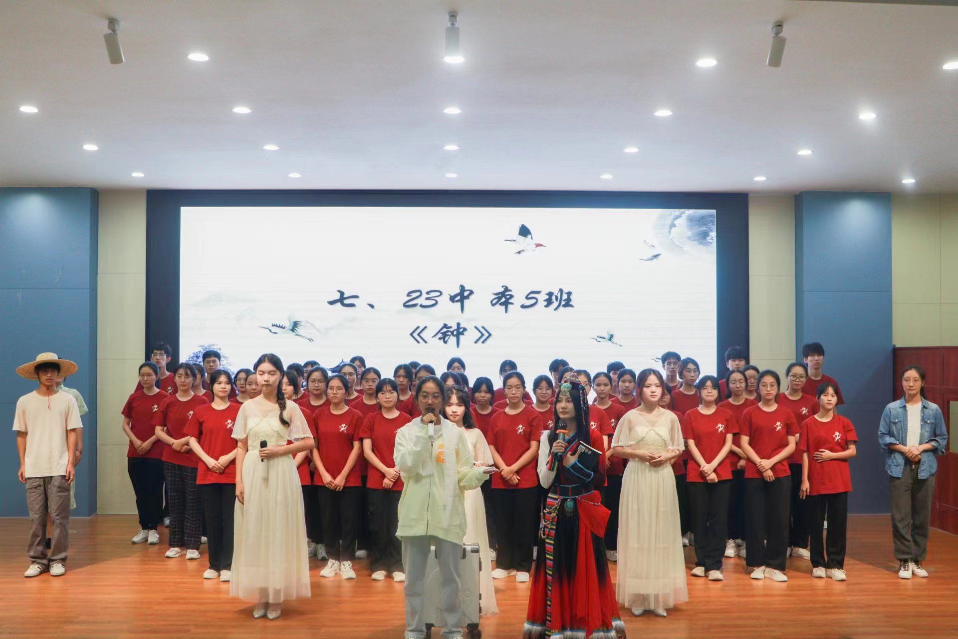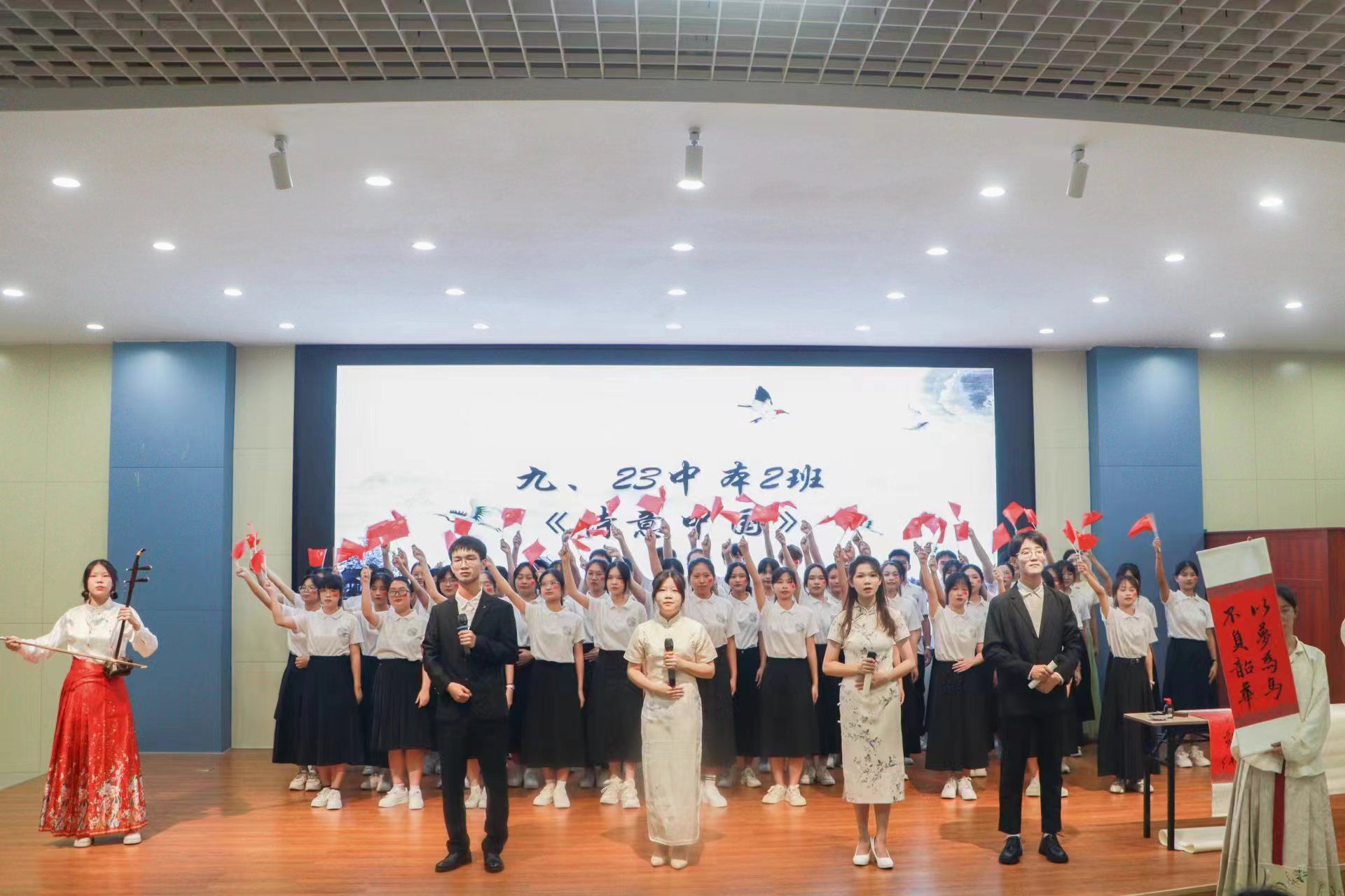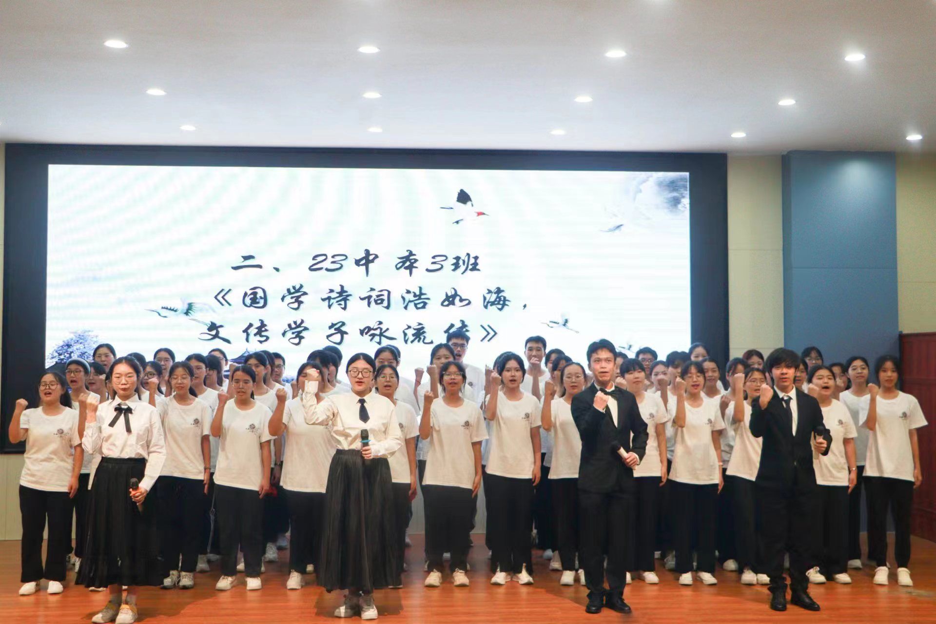 22、23级共15个班级参加了本次大赛。在各班朗诵的诗文中,有精彩的原创诗文,也有融入传统经典的诗文,参赛班级各有风采,形式丰富。其中23中本3班的表演以一段轻盈的古典舞开场,随后同学们齐声朗诵原创诗文《国学诗词浩如海,文传学子咏流传》,同学们着装整齐划一,朗诵气势磅礴,诗文中结合文传学子的生活点滴,最后上升到中国文化,十分新颖独特。23中本5班的《钟》以短小的情景剧配合对应的诗文展现了中国近现代不同时期的代表人物的故事,像红船的守卫者、“第一书记”黄文秀、援藏良驹、袁隆平爷爷,每个小故事都真挚感人,为观众们献上了一场精彩纷呈的视听盛宴。23中本2班的同学手持红旗配合着动作吟诵《诗意中国》,一旁有身穿汉服的同学现场临摹书法,还有配合着朗诵声表演二胡的同学,古典音乐的加持使朗诵表演更加震撼,同学们声情并茂、激情澎湃的表演深深地感染了在场的每一位观众,整个赛场高潮迭起,掌声雷动。