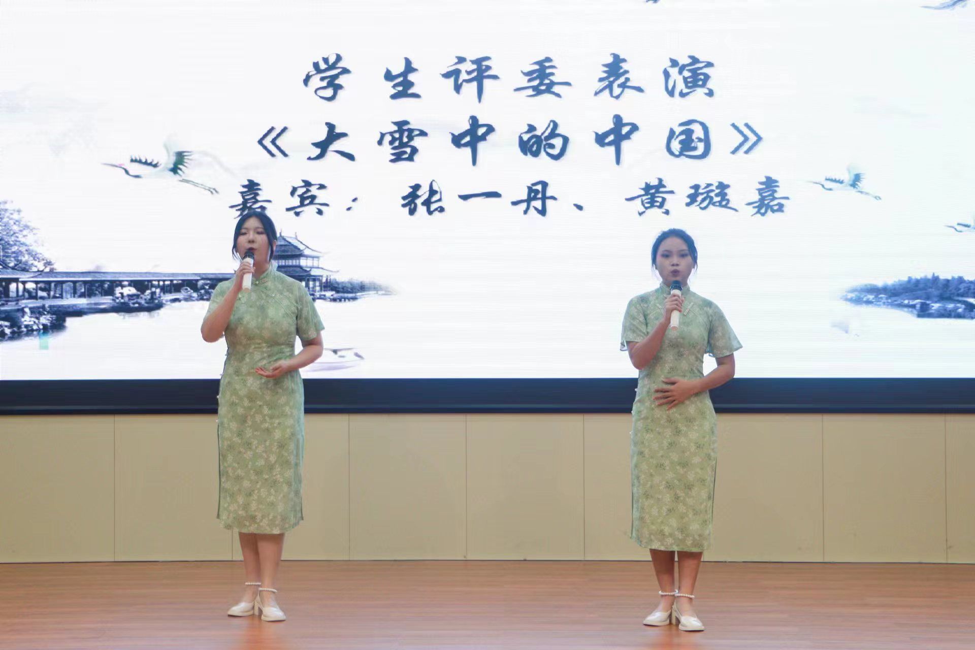紧接着是学生评委嘉宾的表演,她们身着青绿色的旗袍,以饱满的感情掷地有声地朗读《大雪中的中国》,把对祖国的热爱之情表达得淋漓尽致。随后是来自中国风文化交流协会的走秀,她们将古色古香的舞蹈与情景剧进行结合展现了不同朝代的汉服之美。